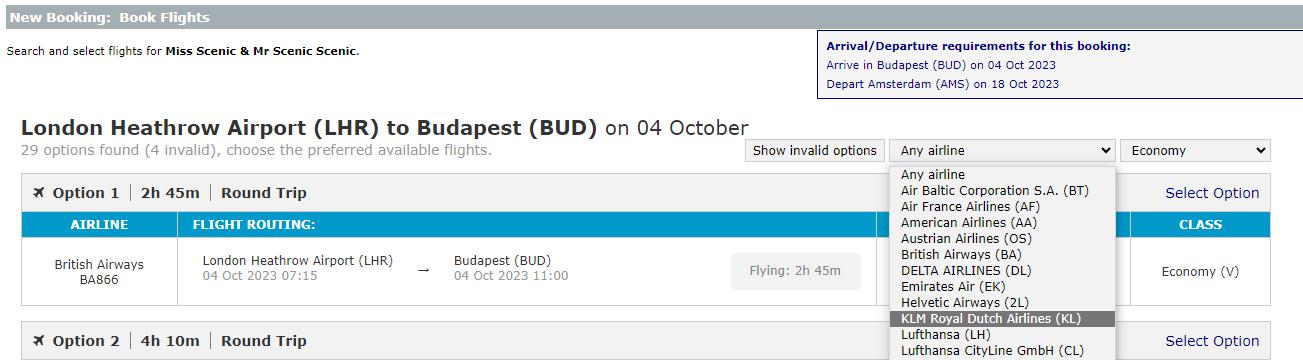 15. Flights are shown in order of shortest total duration. You may filter results by selecting a specific airline or cabin class. This is useful if your client has an airline preference.