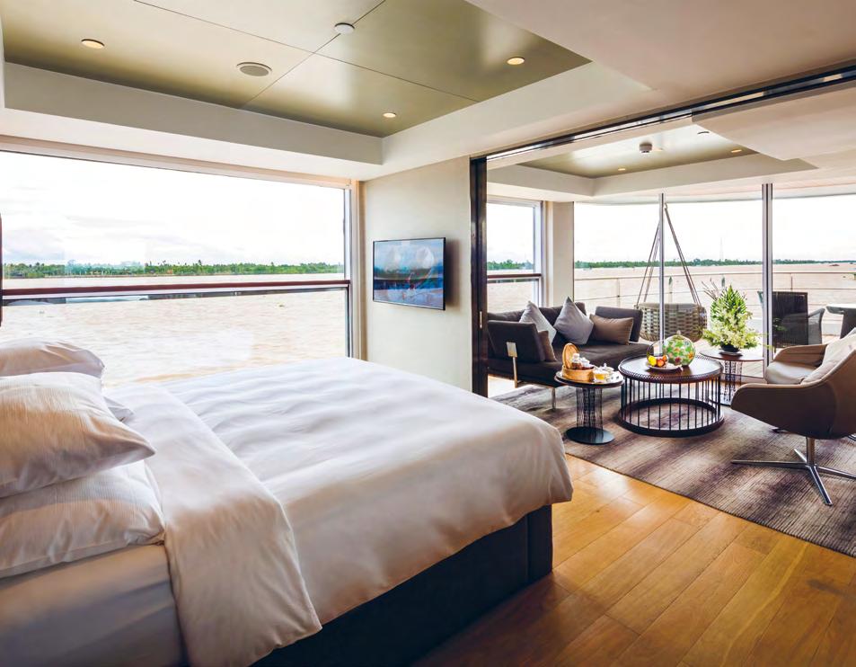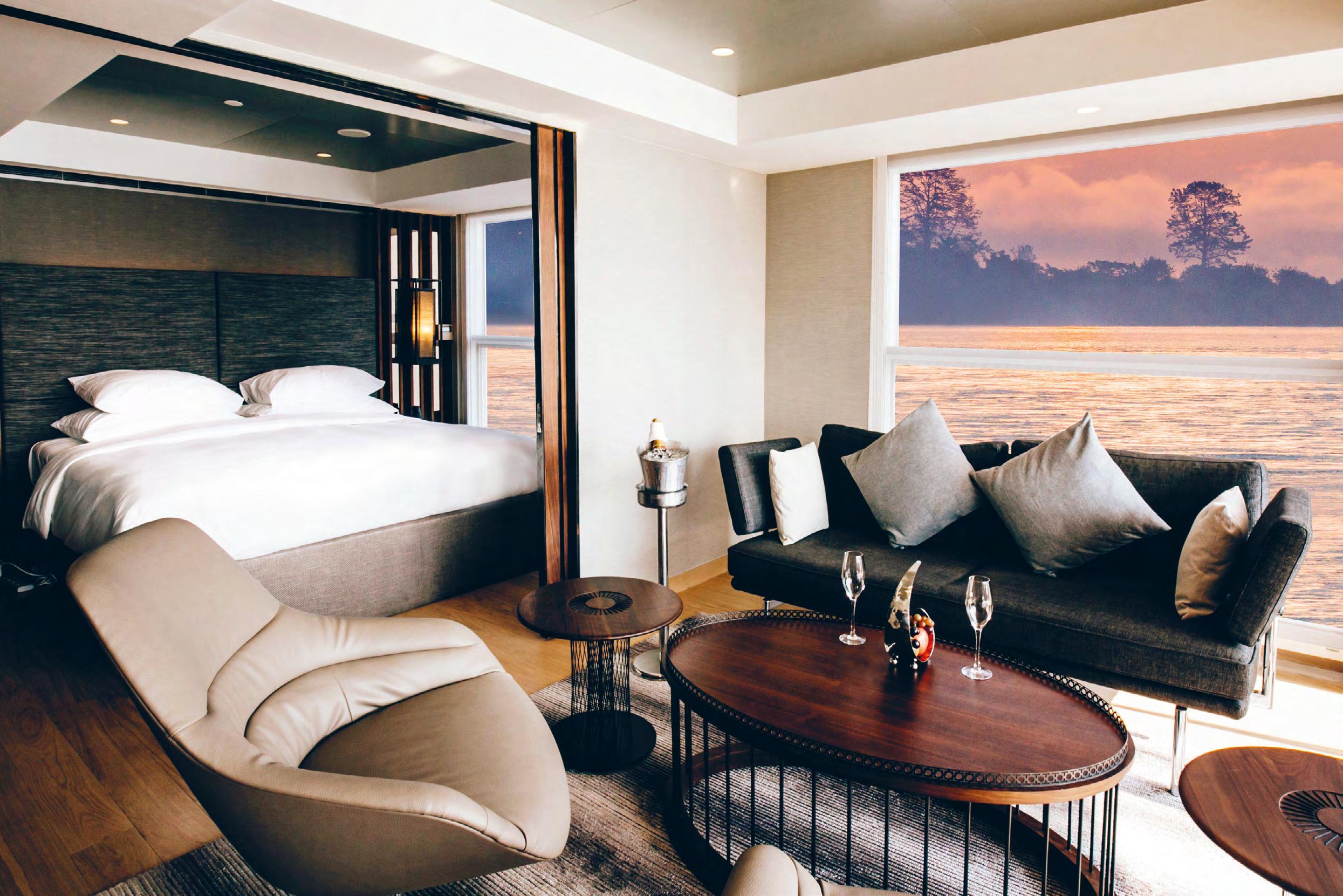 The most spacious lead-in suites available on the Mekong River, our 32m2 Deluxe Suites feature a separate bedroom and lounge area, a Scenic Sun Lounge, elegant furnishings and a pillow menu.