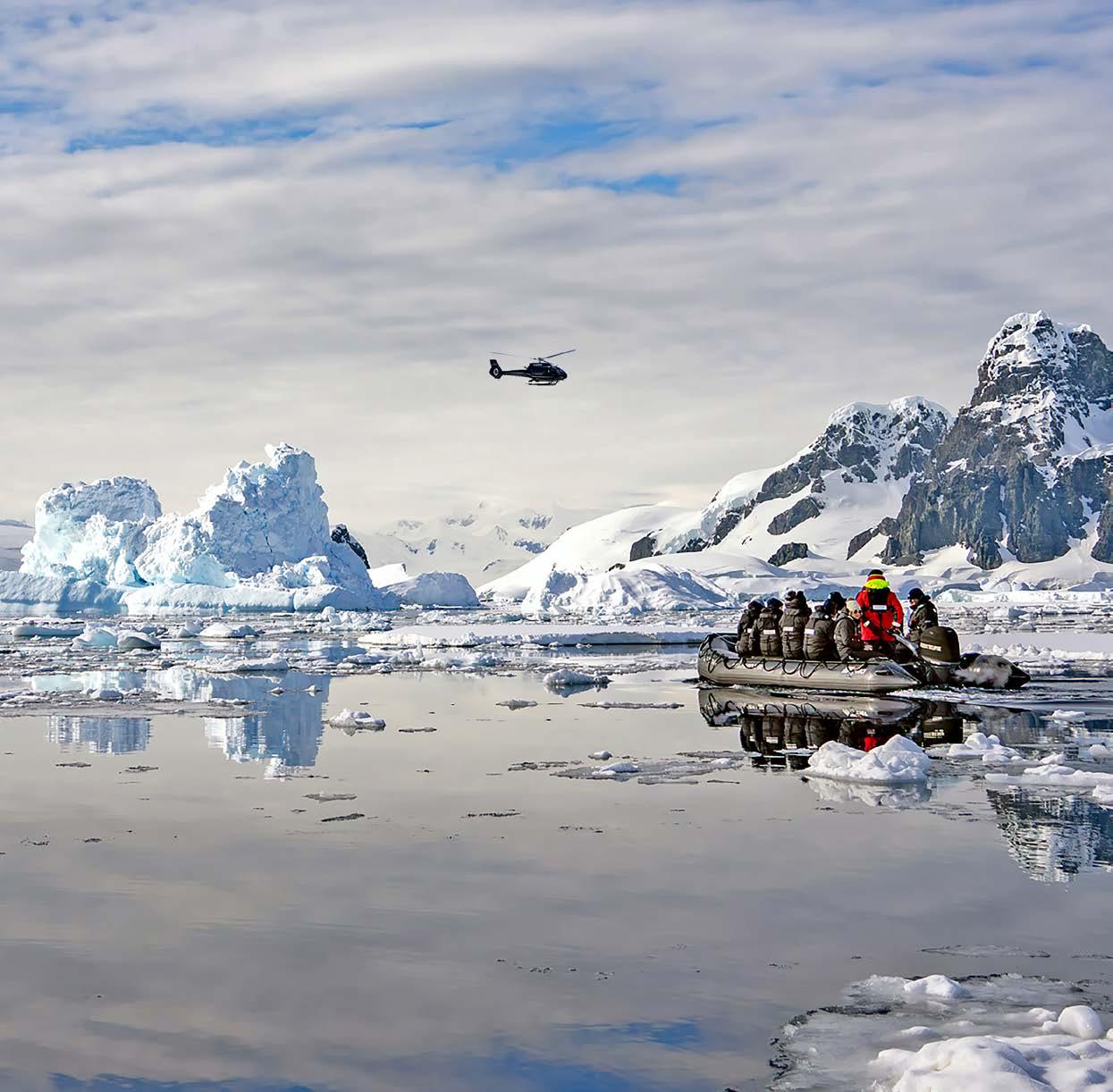 Enjoy a seamless, four-dimensional discovery experience, combining exploration beneath the surface by submersible^ with on-water experiences by Zodiac, kayak, and more. Take in perspectives from above the horizon by helicopter^ and explore on land with expert guides.