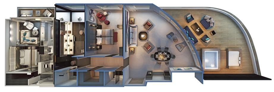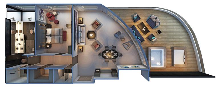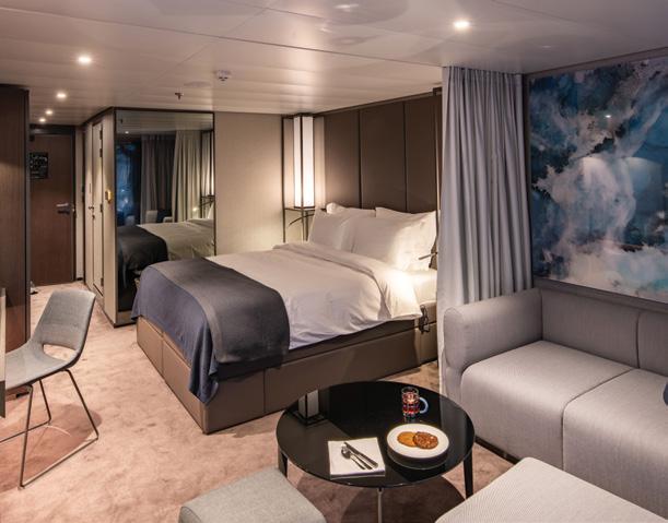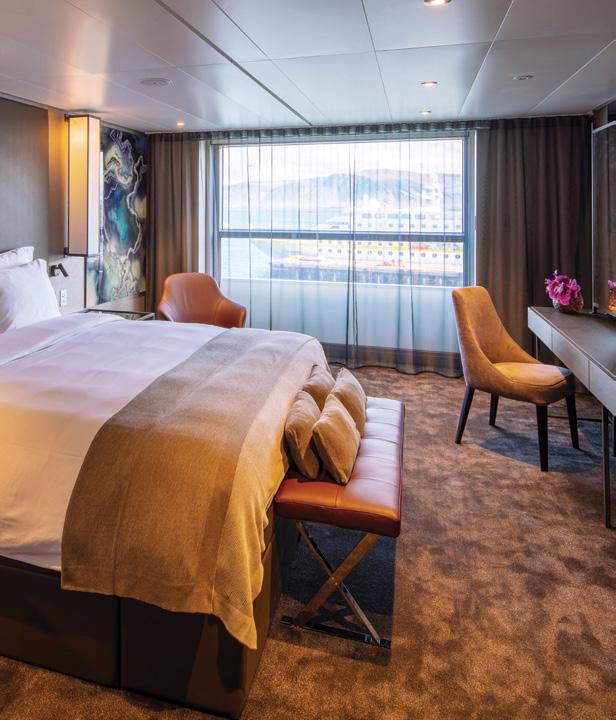 These elegant suites feature their own Scenic Sun Lounge, pillow menu, and enjoy the benefits of the Diamond Deck. Allow your butler to assist with complimentary daily canapes, beverage service, daily pressing of two pieces of clothing, and more.