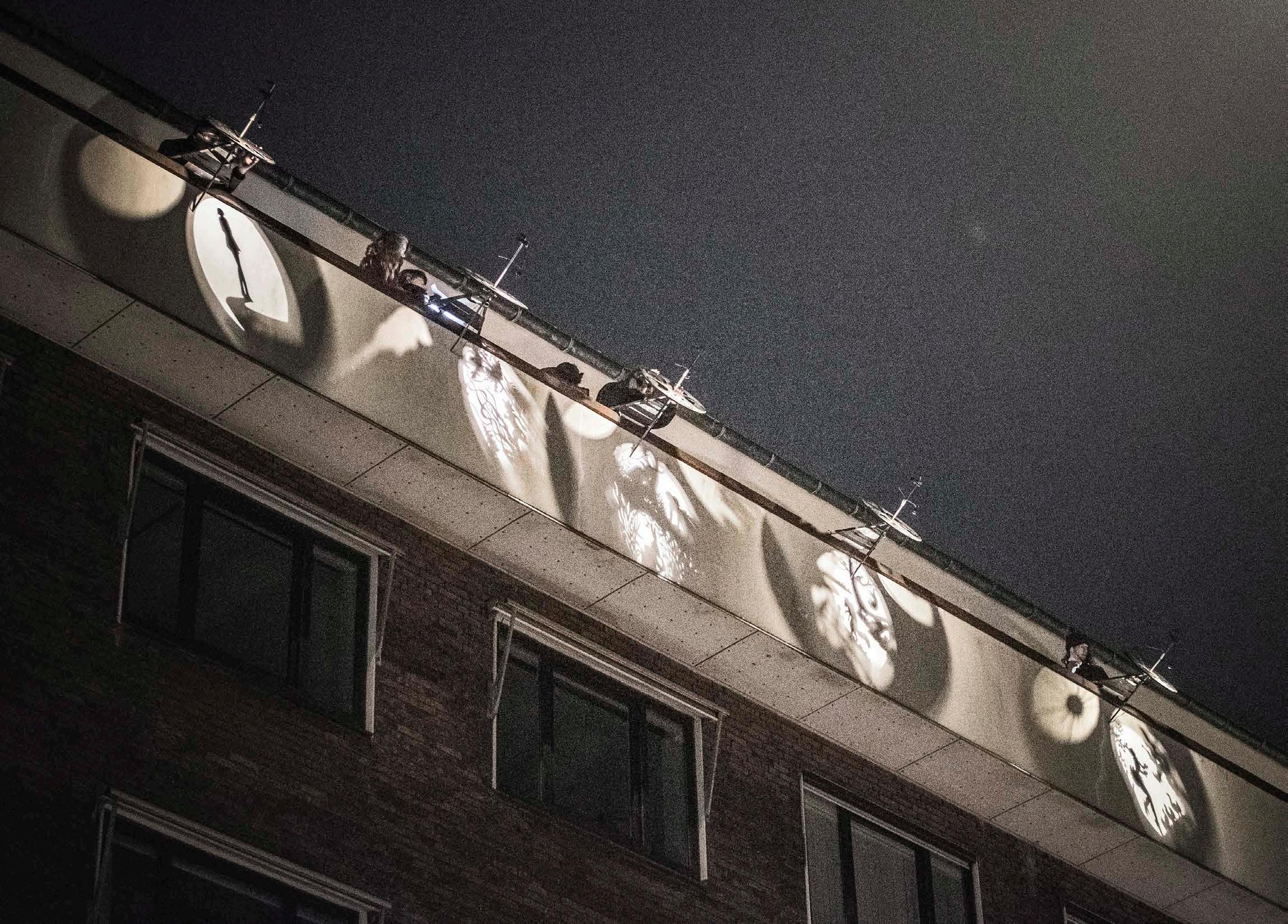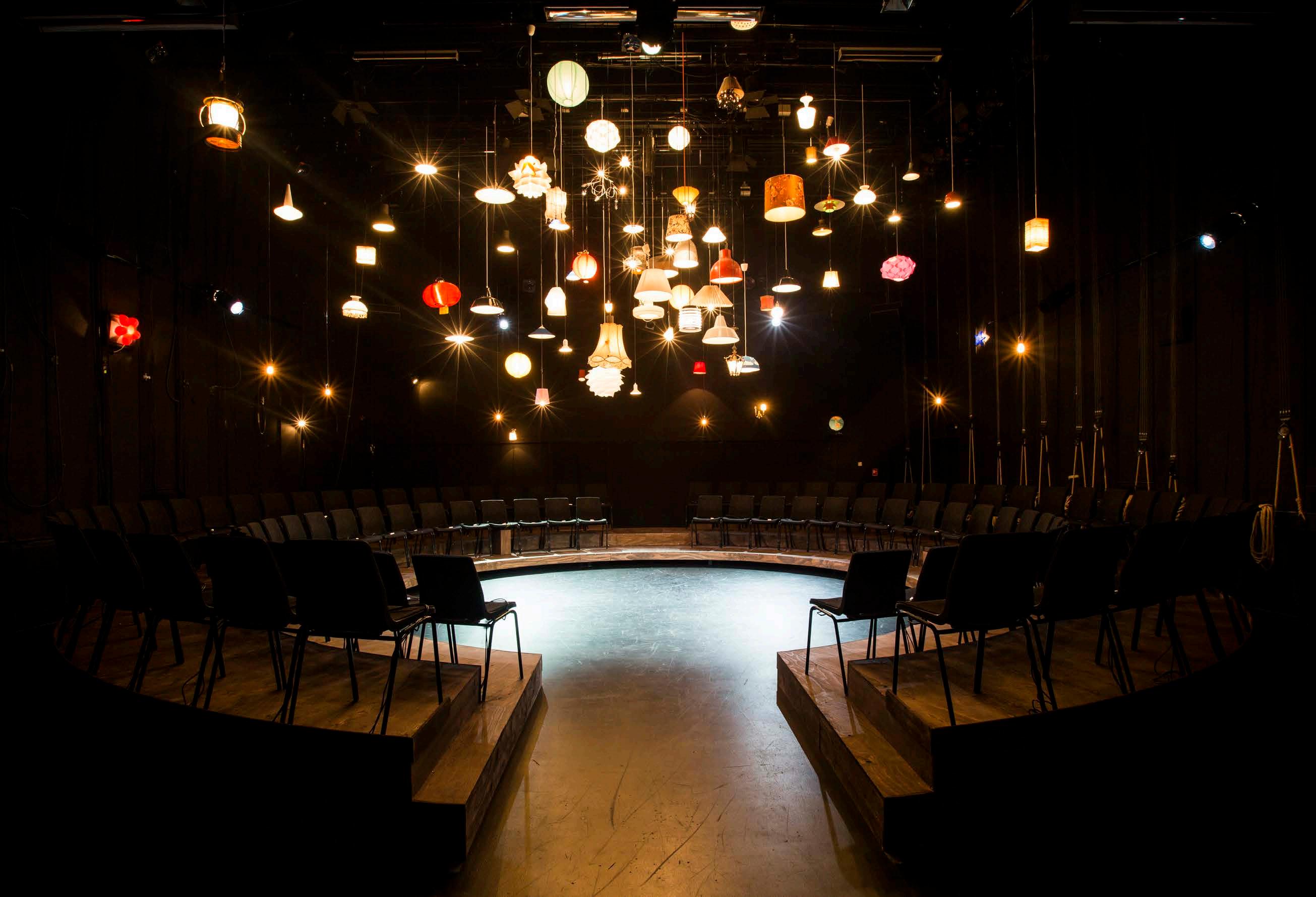 Throughout the piece, the audience members have access to a personal light switch which controls a random roof lamp. The lamps function as an extension of the spectator, who through a flick of the switch can express their opinion on confronting statements made during the show. The individual remains anonymous, while the opinions of the audience as a mass becomes visible. How many in the space believes in God? How many supports euthanasia? Are our immigration politics too strict?