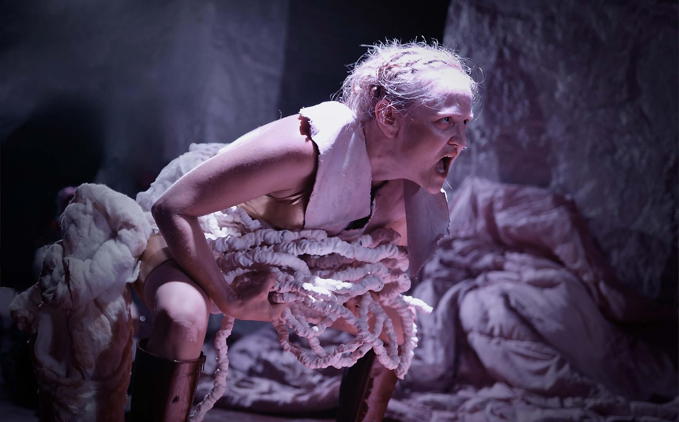 When the ground beneath you vibrates like music and the scenery moves like feminine curves, you encounter Miss Max Maxine. Queer, in a landscape of breasts, placentas, umbilical cords, hair, overtones, and throat singing, she pounds the offspring out of the wall.