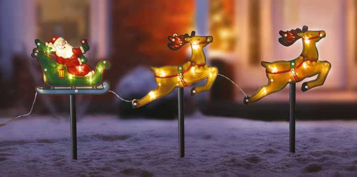Inject an element of Christmas magic with the Santa sleigh stake lights. Includes 23 warm white LEDs over three stakes, Santa & his two reindeer. Auto timer: 6 hours on, 18 hours off. Requires 3 x AA batteries (not included). Plastic. Height of each stake: 53cm. Lead length from battery pack to first stake: 50cm. 30cm light spacing. Total length: 1.1m. Suitable for indoor or outdoor use. 90822 £17/€20