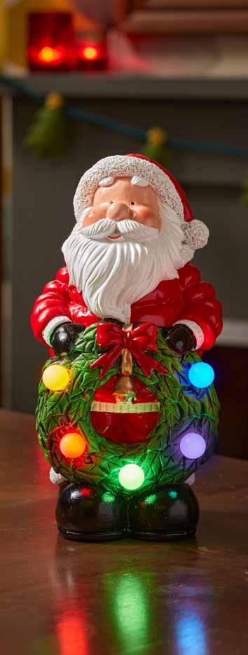 This cheerful Santa, holding a glowing green wreath, is the perfect Christmas decoration for any home. He has the traditional red clothing and hat with rosy, red cheeks. Hand-painted. 5 LEDs. Requires 2 x AAA batteries (not included). Resin. Size: H25 x W12.5 x D12cm. 90681 £19/€22.50 5 MULTI-COLOURED LEDS