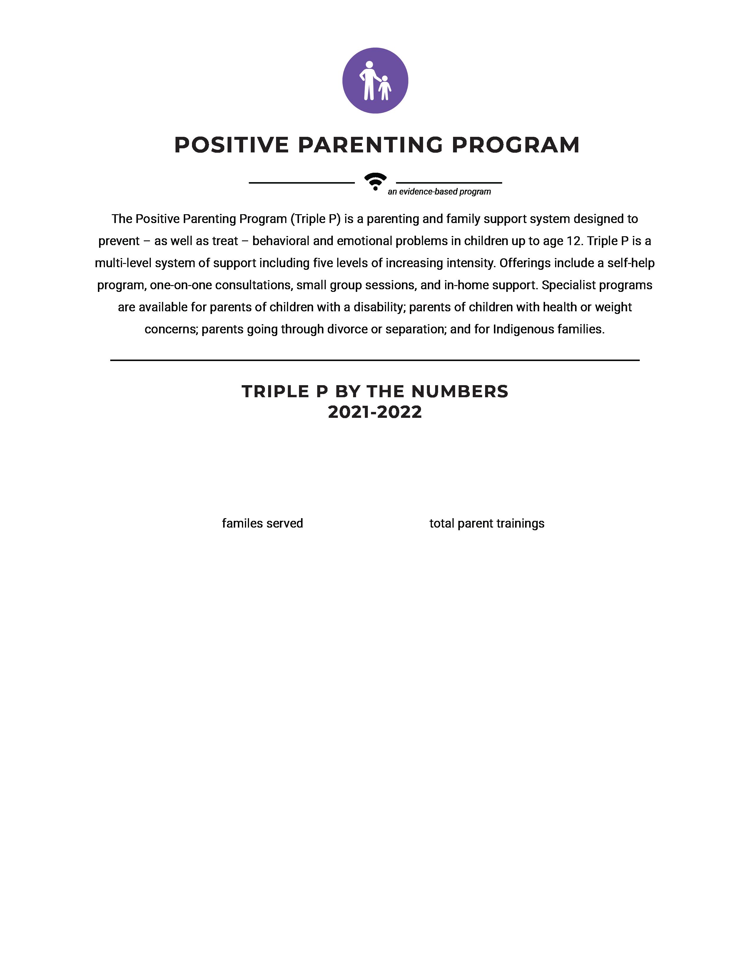 POSITIVE PARENTING PROGRAM TRIPLE P LIGHT TO MODERATE BY THE NUMBERS 2021 - 2022 411 families served 165 total home visits