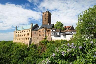 Schon von der Autobahn aus sticht die prunkvolle Wartburg auf dem grünen Hügel ins Auge. In der zum UNESCOWeltkulturerbe erklärten Burg erhält man einen Eindruck vom Mittelalter und dem Leben Martin Luthers. Hier fand der Reformator des Christentums so viel Ruhe, dass er die Bibel erstmals ins Deutsche übersetzen konnte. Unterhalb der Burg zeigt sich die Stadt gemütlich, historisch und beschaulich. Alte, unbewohnte Villen erzeugen Charme. Das größte Event ist das alljährliche größte Frühlingsfest Deutschlands. Außerdem ist Eisenach bekannt für Jazz-Open-Air-Konzerte und „Reggae-Nights“. Seit der Industrialisierung hat sich Eisenach dem Automobilbau verschrieben. Schon 1896 wurde die Fahrzeugfabrik