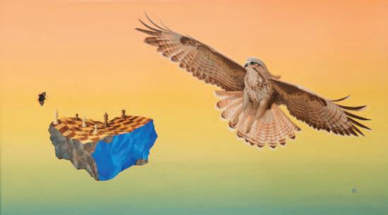 “Mijn fascinatie voor vogels en schaken heb ik in dit schilderij gecombineerd. Het verbeeldt de schaakcompositie van een Franse edelman met als opdracht wit speelt en wint. Pas na vijftig jaar kwam men erachter dat het remise moest zijn.