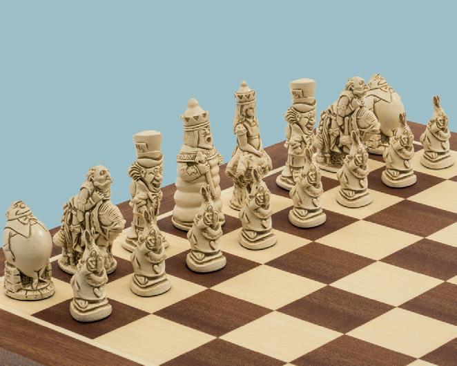Charmante schaakstukken met Alice in Wonderland-thema van de Britse fabrikant Berkeley Chess. KH 8,9 cm. Gemaakt van steenslaghars.