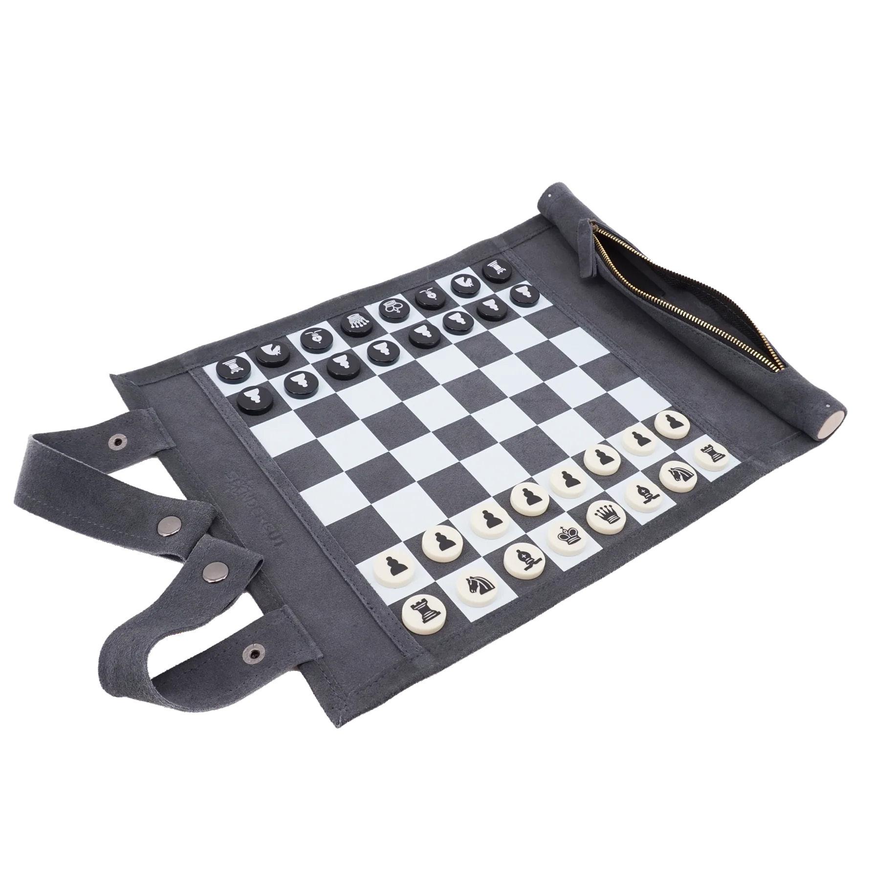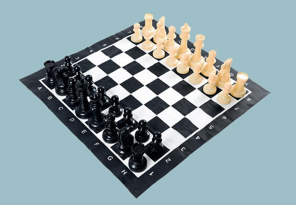 Compacte kunststof schaakset voor buiten. Met kunststof speelstukken en handige draagtas.