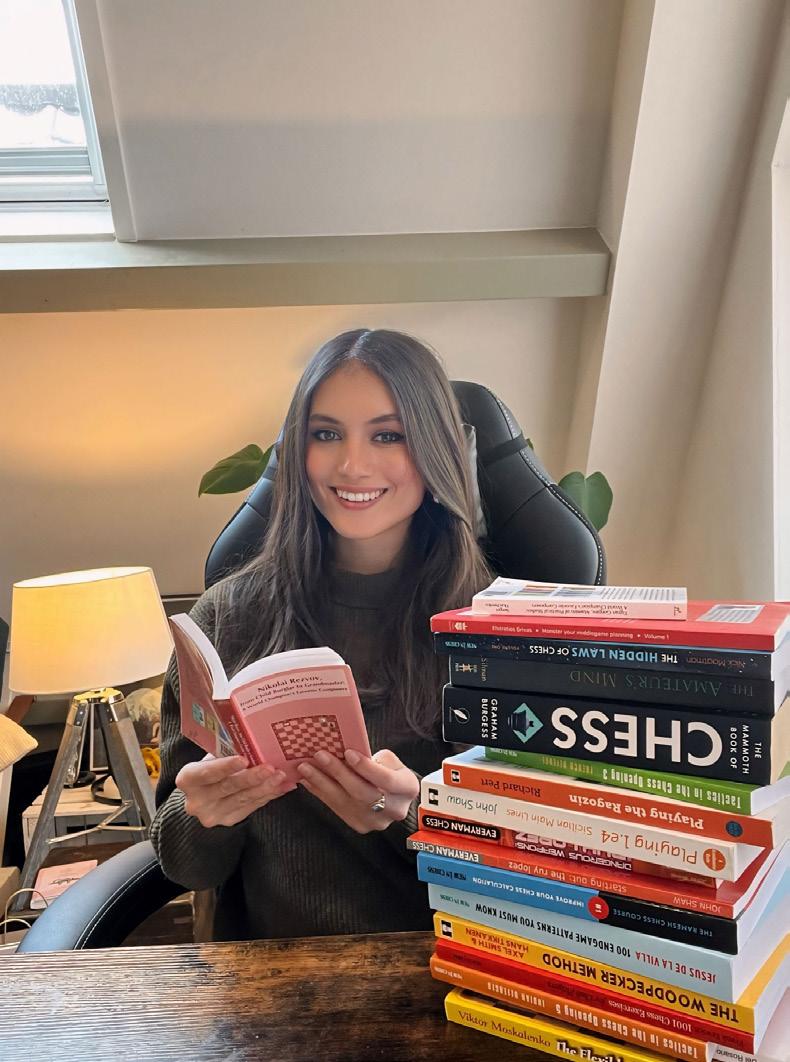 Ze leerde als kind al schaken van haar vader, maar pakte het een paar jaar geleden echt serieus op. Nu is ze ‘hooked’, verslindt schaakboeken en laat met haar razend populaire filmpjes op Twitch, Instagram en TikTok zien hoe leuk schaken is. “Als ik ook maar beetje kan stimuleren dat meer vrouwen gaan schaken, dan heb ik mijn doel bereikt.” 14
