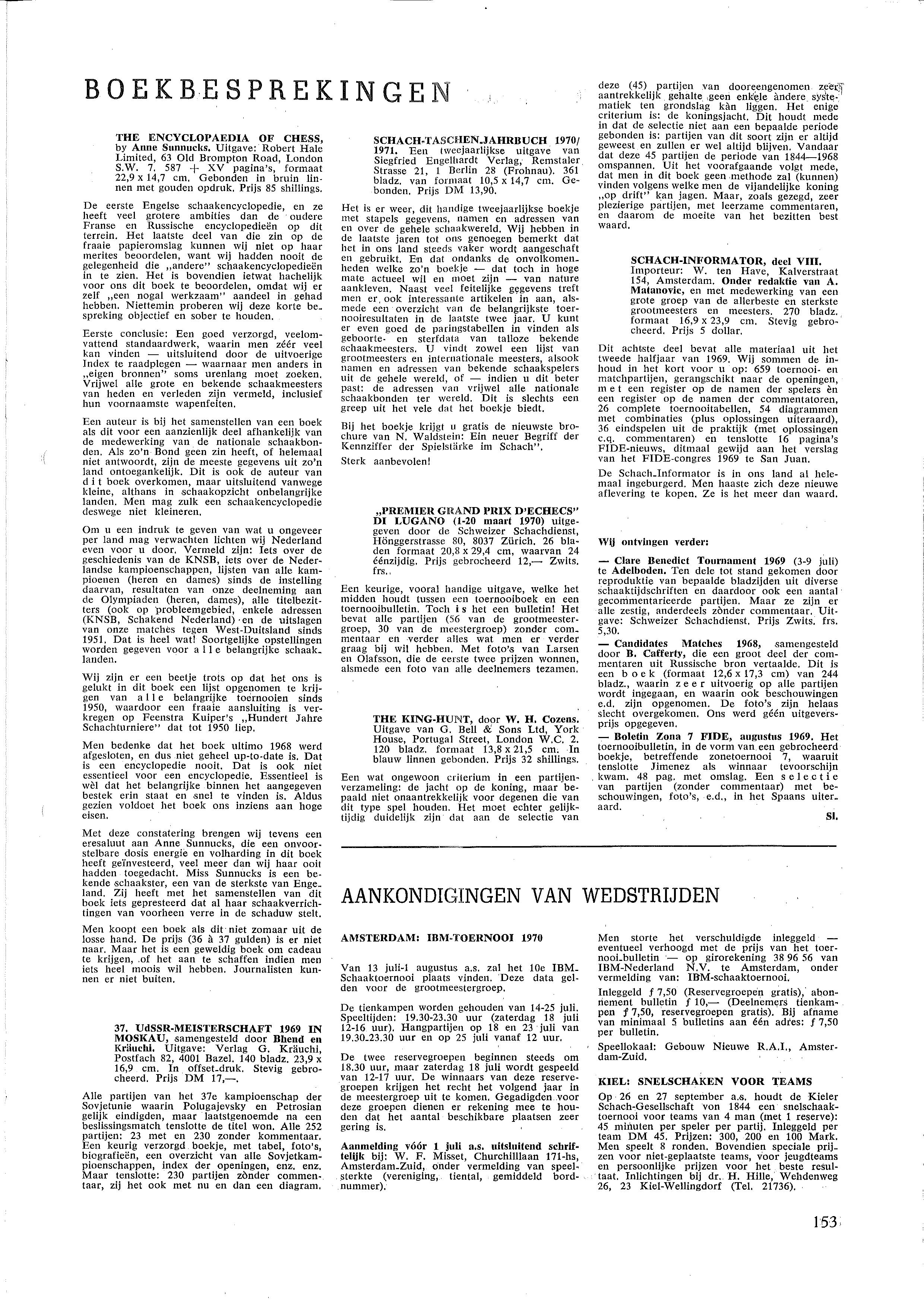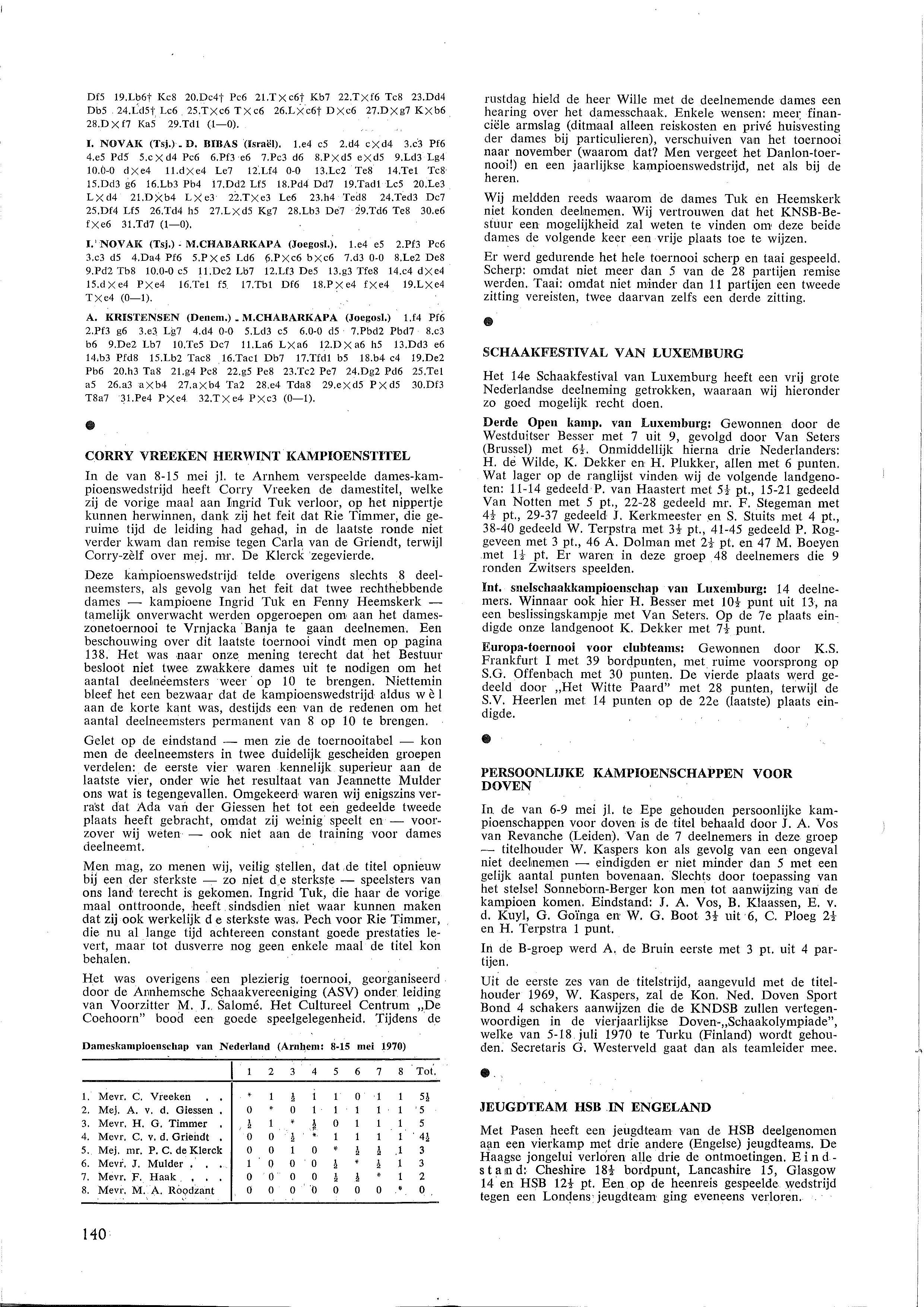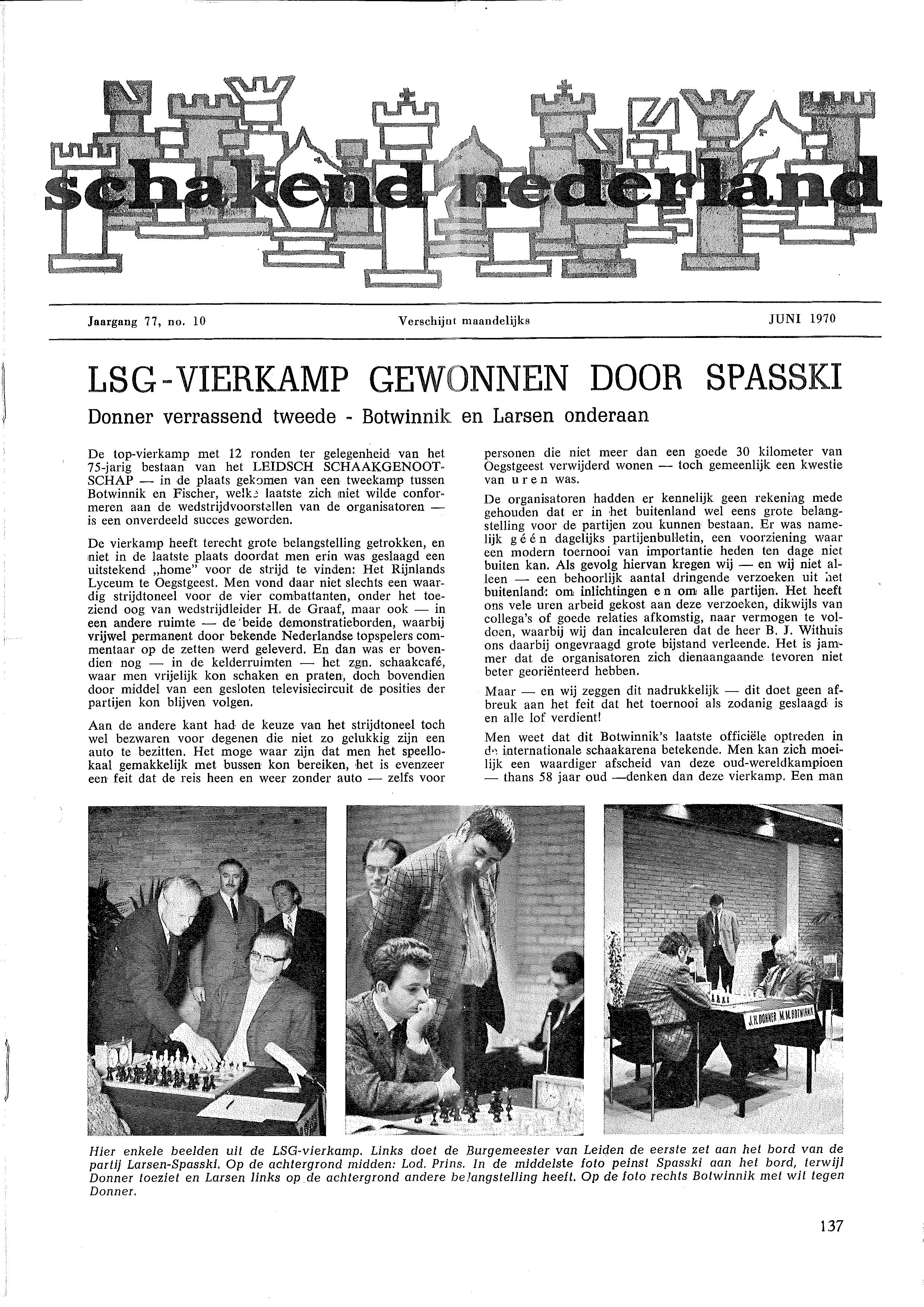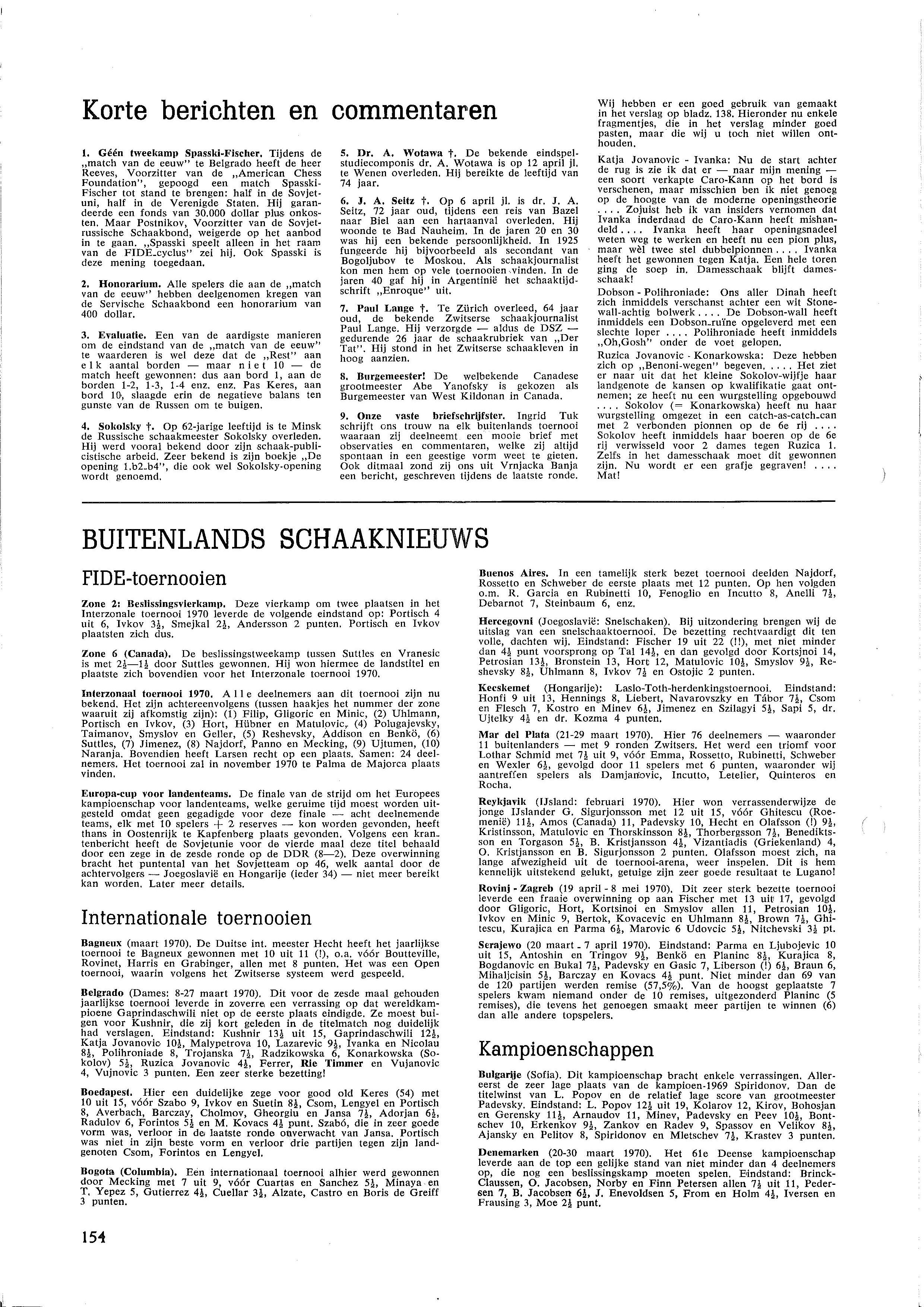 o.a. vierkamp ter gelegenheid van 75-jarig bestaan Leidsch Schaakgenootschap gewonnen door wereldkampioen Spasski; Chabarkapa winnaar wereldkampioenschap voor blinde schakers; Corry Vreeken nationaal dameskampioen; Watergraafsmeer kampioen hoogste klasse KNSB-competitie; Rob Hartoch snelschaakkampioen van Nederland