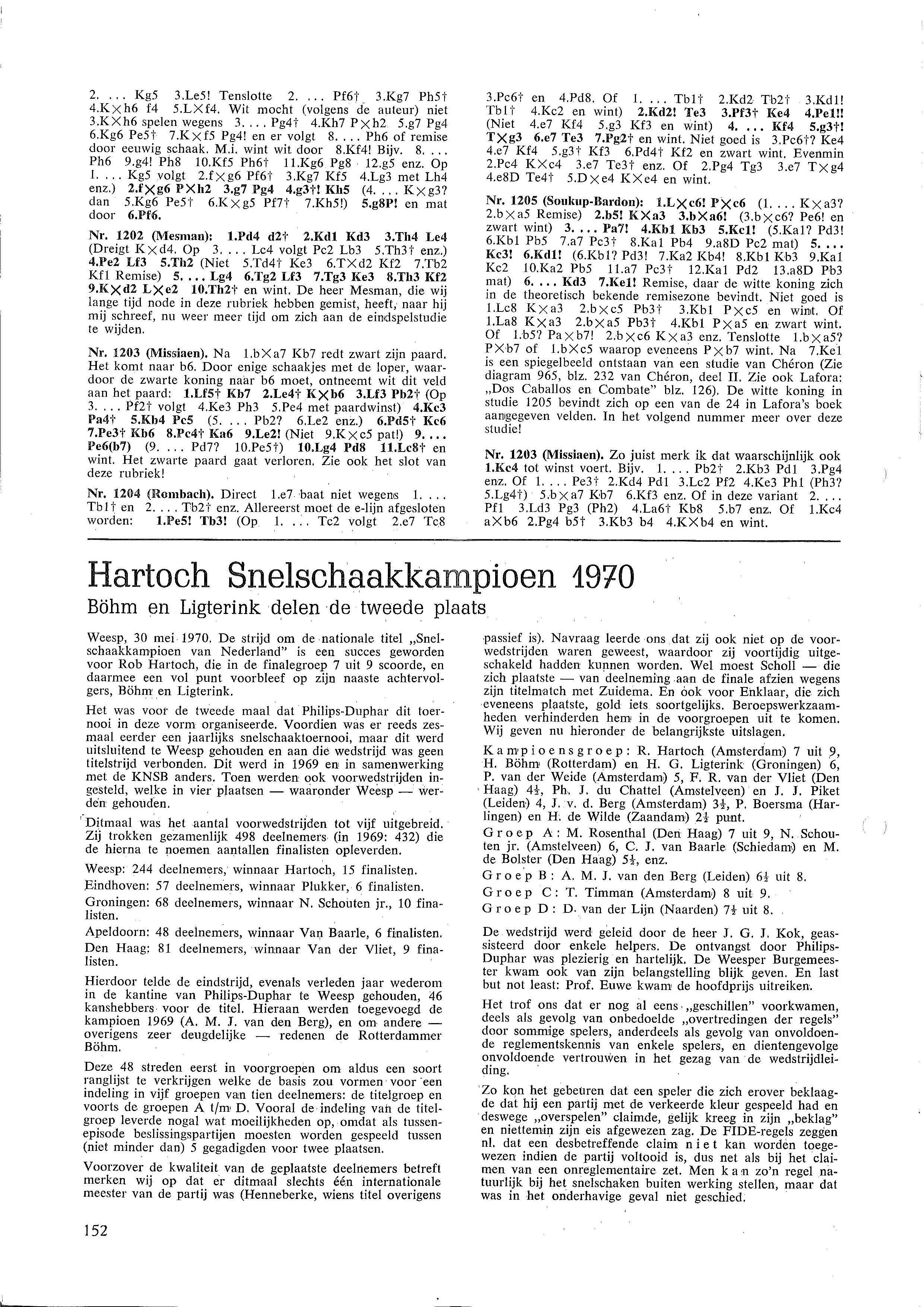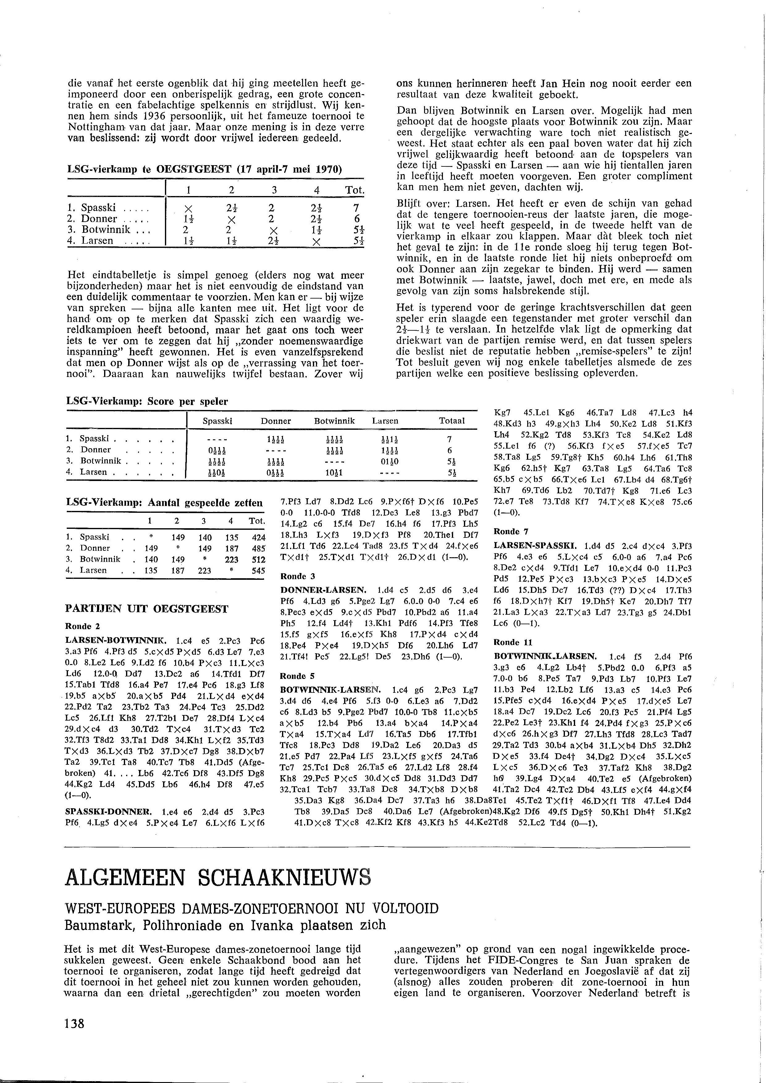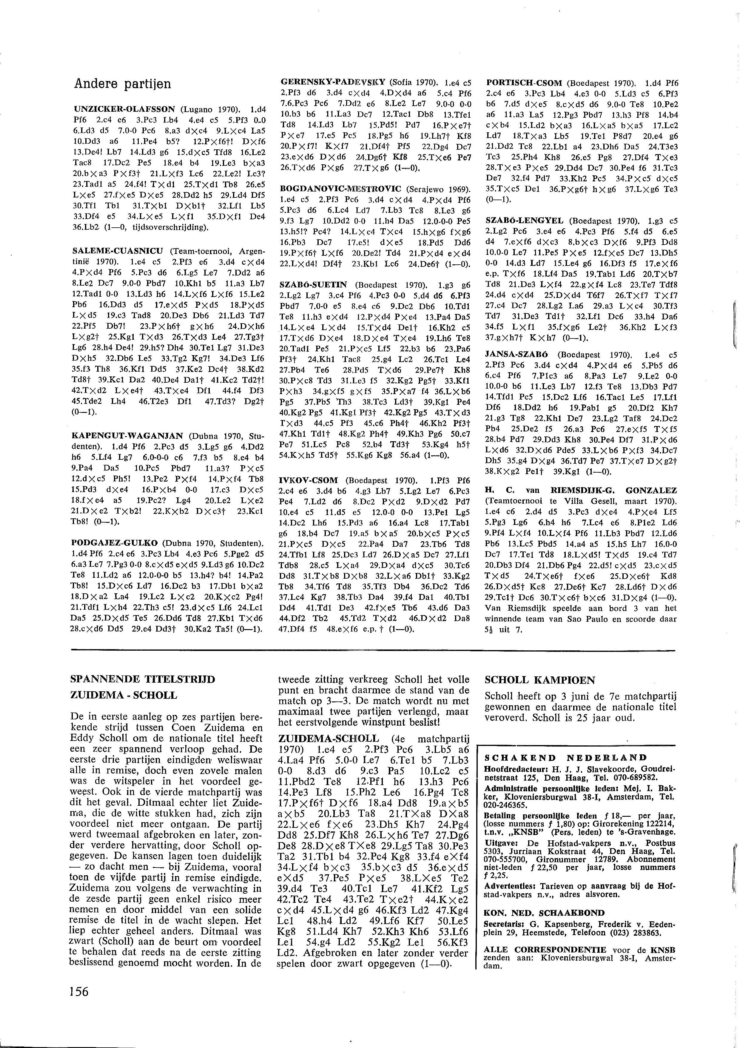o.a. vierkamp ter gelegenheid van 75-jarig bestaan Leidsch Schaakgenootschap gewonnen door wereldkampioen Spasski; Chabarkapa winnaar wereldkampioenschap voor blinde schakers; Corry Vreeken nationaal dameskampioen; Watergraafsmeer kampioen hoogste klasse KNSB-competitie; Rob Hartoch snelschaakkampioen van Nederland