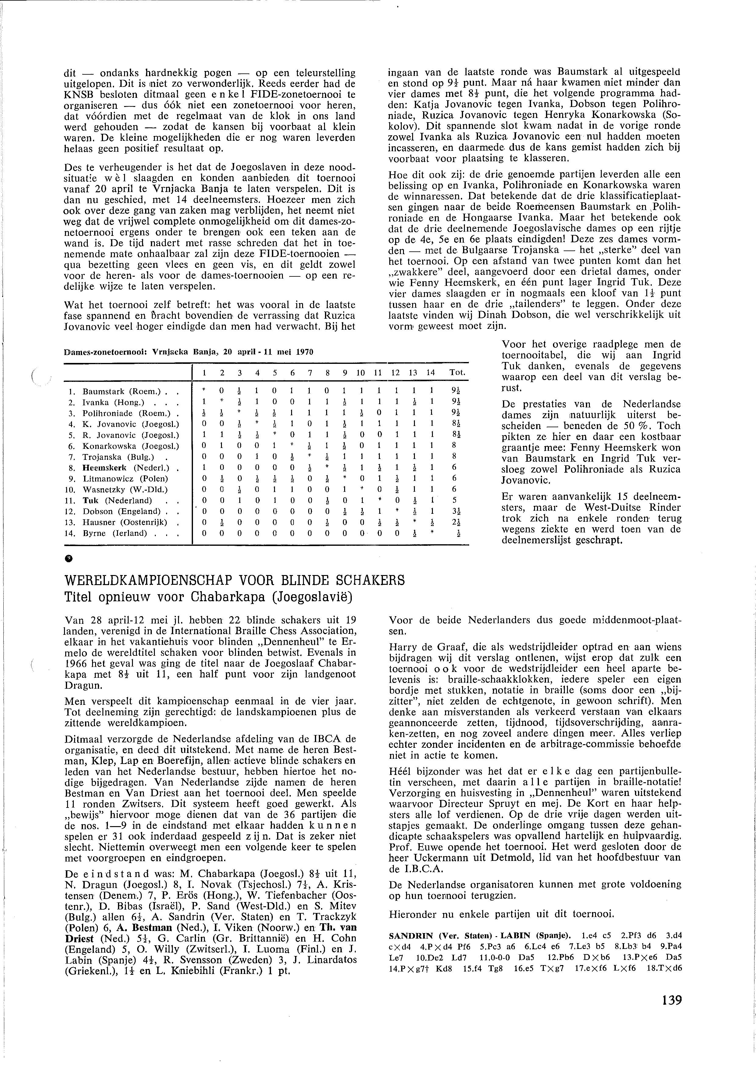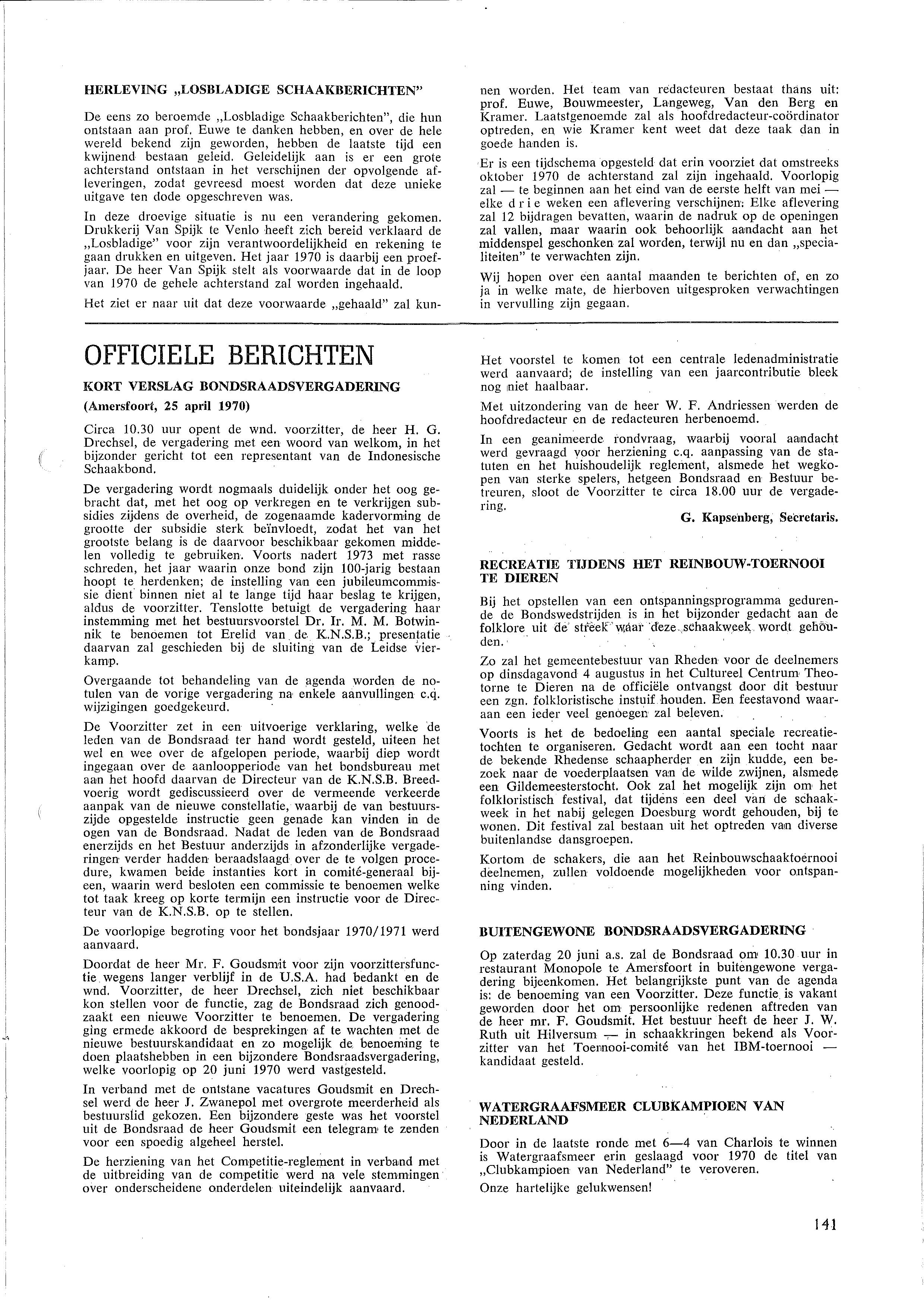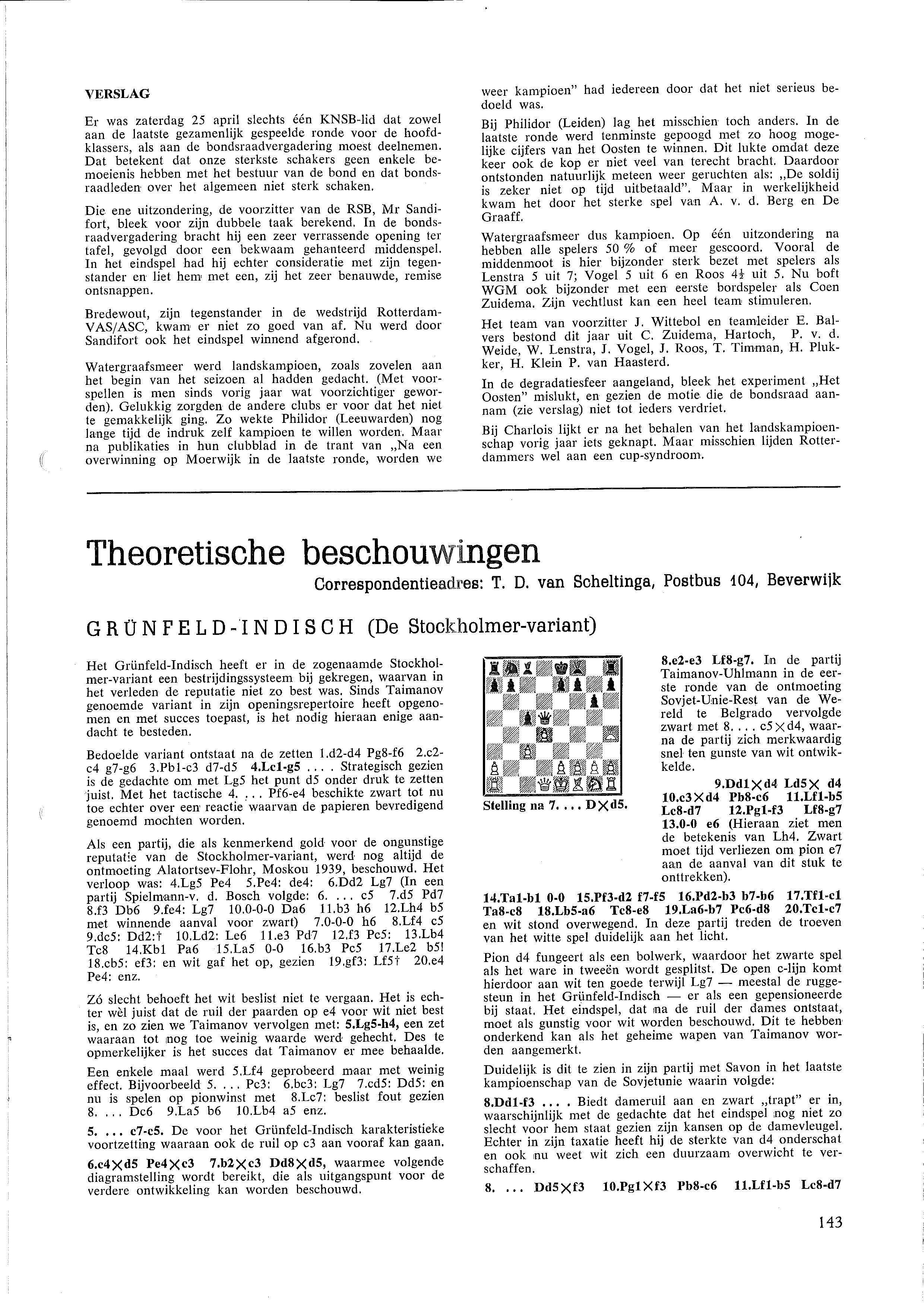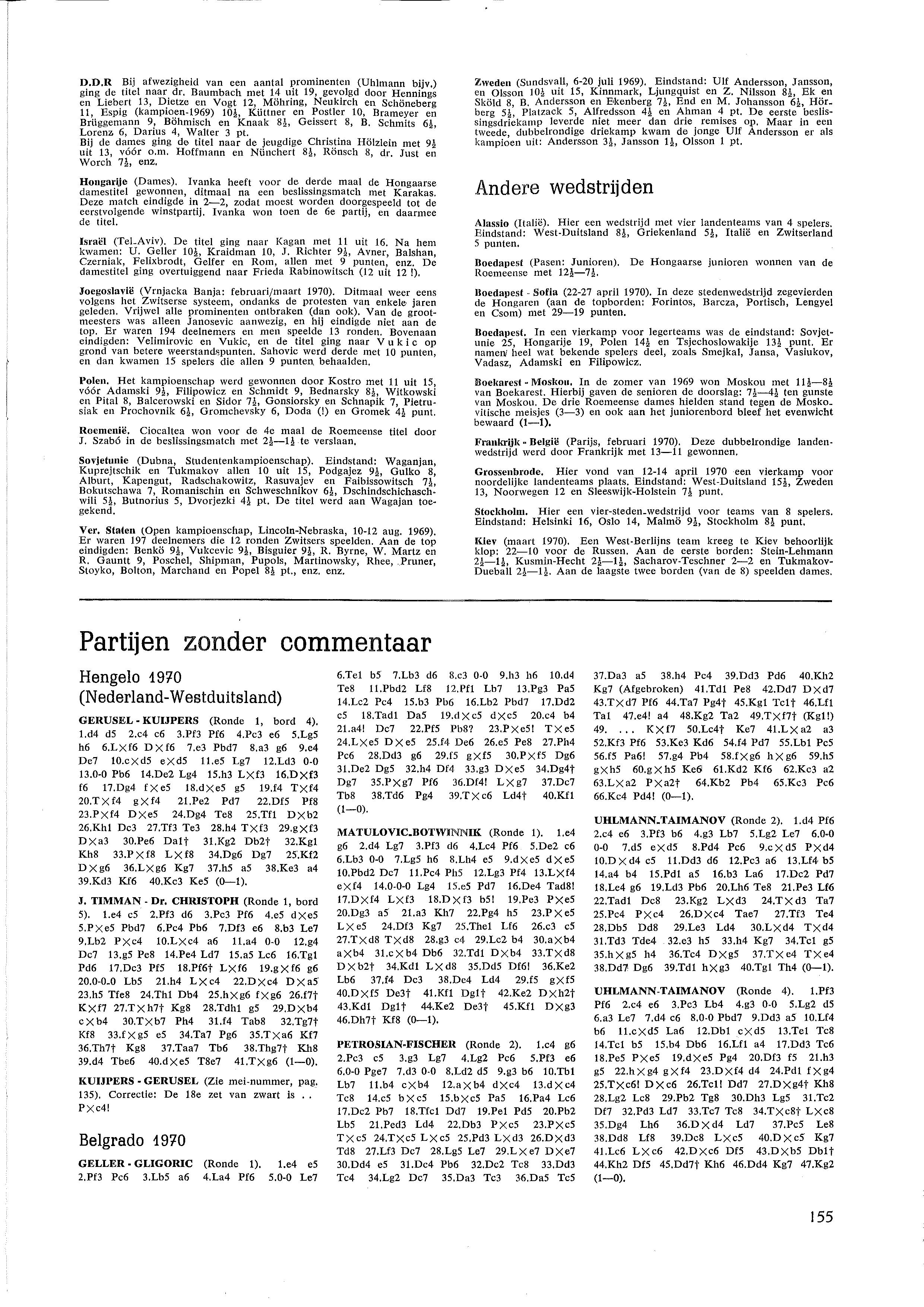 o.a. vierkamp ter gelegenheid van 75-jarig bestaan Leidsch Schaakgenootschap gewonnen door wereldkampioen Spasski; Chabarkapa winnaar wereldkampioenschap voor blinde schakers; Corry Vreeken nationaal dameskampioen; Watergraafsmeer kampioen hoogste klasse KNSB-competitie; Rob Hartoch snelschaakkampioen van Nederland
