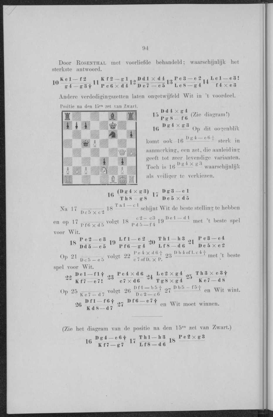 Zwart heeft de voorgift prachtig opgehaald ; zijne ver voorwaarts staande c en d pionnen lijken nu echter sterker dan ze zijn, en bij goed spel zit in de stelling niet meer dan remise.