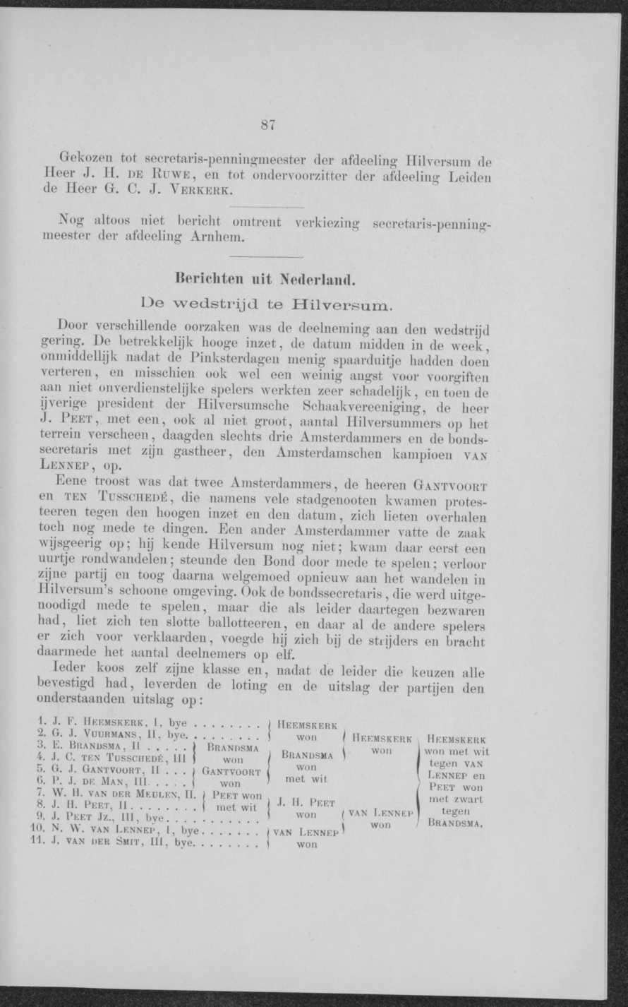 De partij HEEMSKERK—VAN LENNEP was niet overbelangwekkend, maar toch niet geheel zonder beteekenis; de Nederlandsche Sport plaatste haar; de partij BEET—VAN LENNEP, waarin de jonge kampioen prachtig de voorgift ophaalde volgt onder de rubriek Practisch Spel.