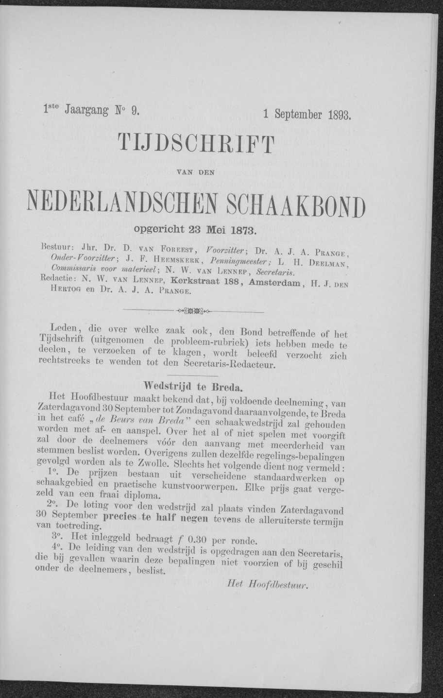 Een enkel woord wenschte ik nog aan deze officieele afkondiging toe te voegen: In Hilversum en Zwolle was de gedeeltelijke mislukking van den wedstrijd te wijten aan de geringe opkomst dor leden, in Arnhem aan de afwezigheid van een bestuurslid. Wat het laatste betreft, voldoende maatregelen zijn getroffen opdat zoo iets niet meer zou kunnen voorkomen en wat het eerste aangaat, het bestuur meent thans zulke conditiën en een zoodanig tijdstip vastgesteld te hebben, dat geen lid verontschuldigd is zoo hij wegblijft. De Bredasche afdeeling zelf koos als datum 30 September en 1 October, terwijl het uur van aanvang, 872 uur> den Amsterdamschen, Utrechtschen, Arnhemschen en Rotterdamschen spelers gelegenheid verschaft met prachtige sneltreinen juist bij tijds op het terrein aanwezig te zijn. Yeel prijzen worden uitgeloofd; liet inleggeld is zoo laag mogelijk gesteld, terwijl het uitreiken van diploma's, naar ik hoop, algemeenen bijval zal vinden. Met het oog op het aantal prijzen dat moet worden aangekocht is het wenschelijk, dat aanmeldingen zoo spoedig mogelijk bij den Secretaris inkomen.