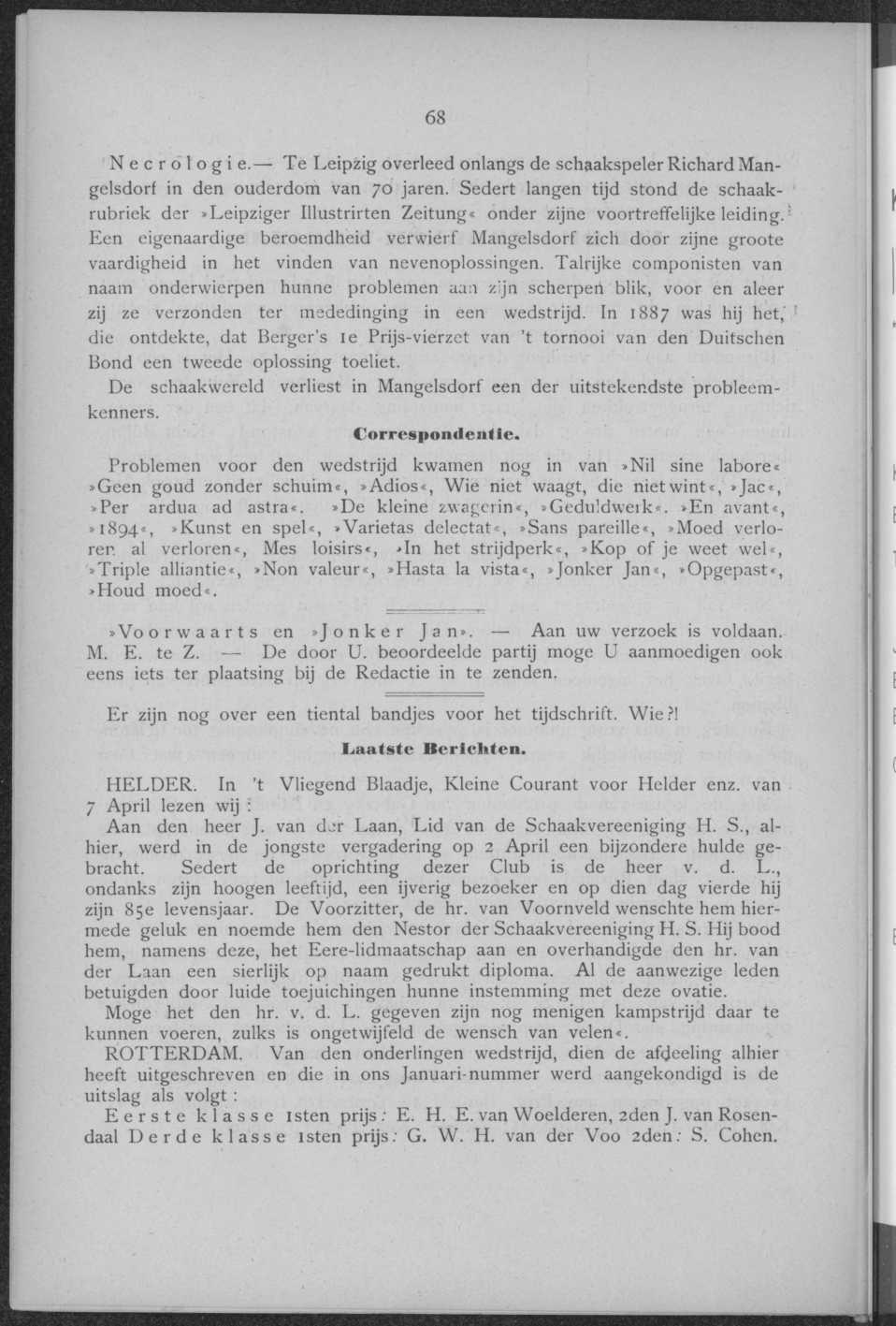 N e c r o 1o g i e.— Te Leipzig overleed onlangs de schaakspeler Richard Mangelsdorf in den ouderdom van 70 jaren. Sedert langen tijd stond de schaakrubriek der »Leipziger Illustrirten Zeitung* onder zijne voortreffelijke leiding. Een eigenaardige beroemdheid verwierf Mangelsdorf zich door zijne groote vaardigheid in het vinden van nevenoplossingen. Talrijke componisten van naam onderwierpen hunne problemen aa:i z'jn scherpen blik, voor en aleer zij ze verzonden ter mededinging in een wedstrijd. In 1887 was hij het,' die ontdekte, dat Berger's ie Prijs-vierzct van 't tornooi van den Duitschen Bond een tweede oplossing toeliet.