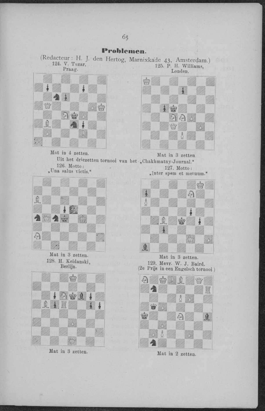 Problemen voor den wedstrijd kwamen nog in van »Nil sine labore* »Geen goud zonder schuim«, »Adios«, Wie niet waagt, die nietwint«, »Jac«, »Per ardua ad astra». >De kleine zwagerin«, »Geduldwerk«. »En avant«, »I894«, «Kunst en spel«, «Varietas delectat«, »Sans pareille», »Moed verloren al verlorene, Mes loisirs», >In het strijdperk«, »Kop of je weet wel«, »Triple alliantie», »Non valeur«, »Hasta la vista«, »Jonker Jan«, «Opgepast», »Houd moed».