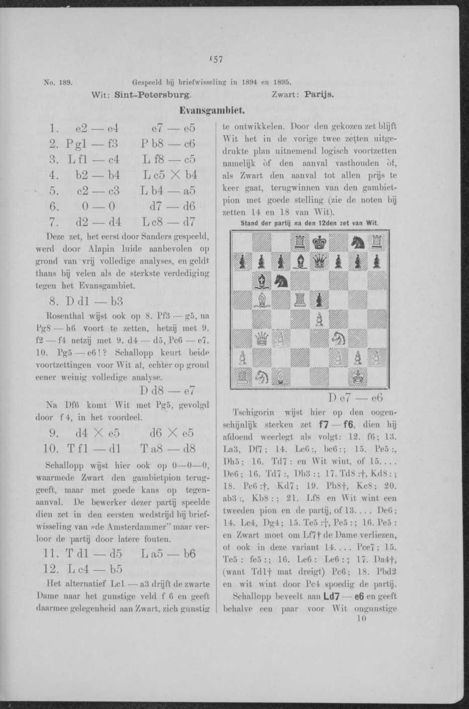 Nevenstaande positie ontstond, zooals onze lezers nu wel bekend zal zijn, na den i2den zet van Wit in de correspondentie-partij St. Petersburg-Parijs. Schallopp heeft in deze stelling voor Zwart aanbevolen : 12—•, Ld7—e6. Genoemde meester heeft waarschijnlijk het onvoldoende ingezien van de argumentatie, waarvan hij dezen zet deed vergezeld gaan. Immers in zijne laatste schaakrubriek in de „Sale-Zeitung" geeft hij eene uitvoerige beschouwing over den door hem voorgestelden zet, waaraan wij het volgende ontleenen: