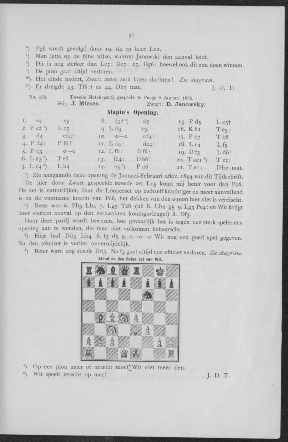 No. 155. Tweede Match-partij gespeeld te Parijs 9 Januari 1895. Wit: J. Mieses. Zwart: D. Janowsky. Alupin's Opening-,