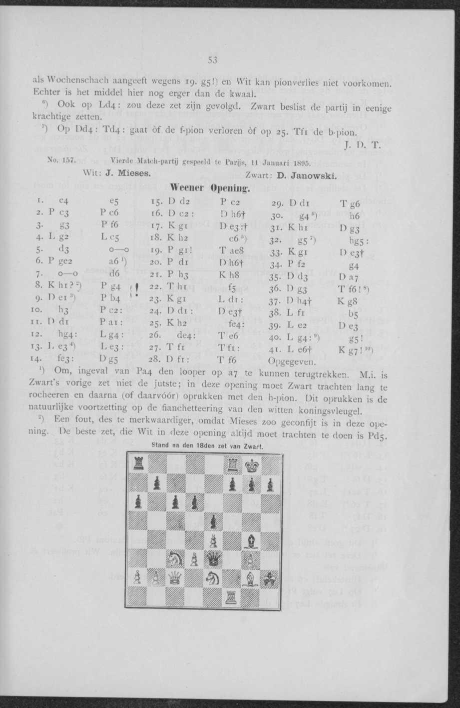 Zeven partijen van de Match Janowski—Mieses. No. 154. Eerste Match-partij gespeeld te Parijs, 8 Januari 1895. Wit: D. Janowski. Zwart: J. Mieses.