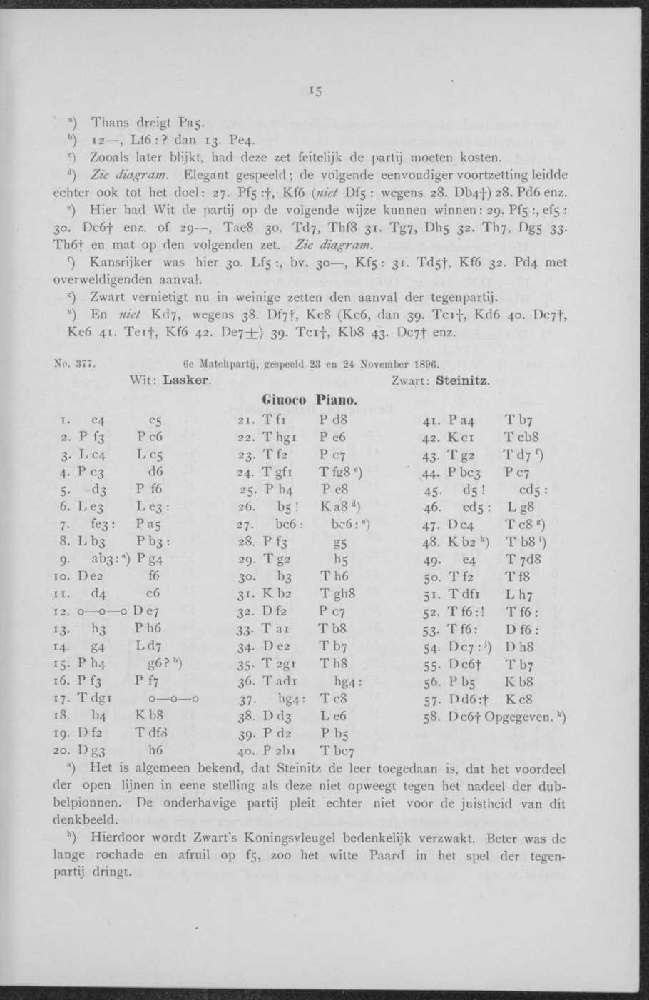 16 3 Tan. Spaansch 42 Lasker (W.) wint. Stand na de i6e partij: Lasker 9, Steinitz 2, Remise 5.