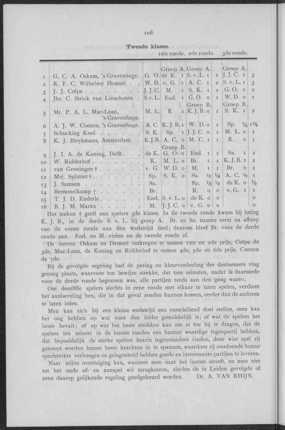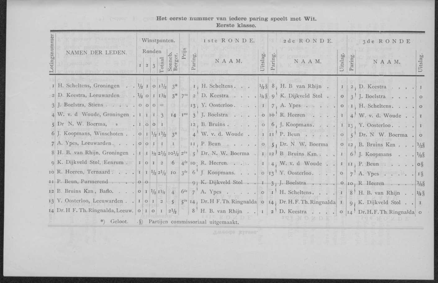 Het teeken f geeft aan spelers 3de klasse. In de tweede ronde kwam bij loting K. J. B., in de derde S. v. L. bij groep A. Br. en Sa. namen eerst na afloop van de eerste ronde aan den wedstrijd deel; daarom bleef Br. voor de derde ronde aan. End. en M. vielen na de tweede ronde af.