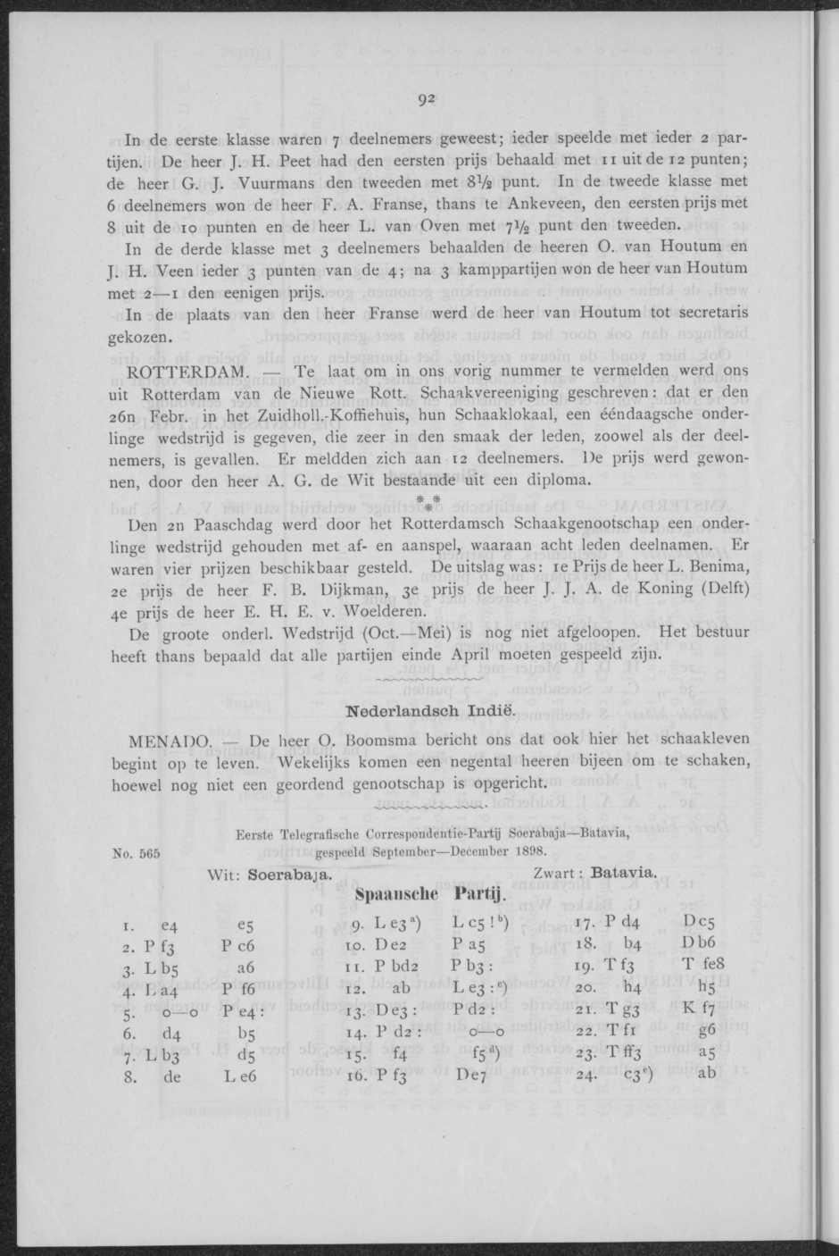 Aan de eerste klasse namen 14 aan de tweede 18 leden deel. Er werden 25 zetten per uur gespeeld en zulks op voorstel van den heer R. Heeren. Zeer weinig partijen werden commissoriaal. Bij enkelen waar zulks noodig bleek verleende o. a. de heer Mr. Tresling adsistentie, die aan allen eene groote verrassing bereidde door zijne aanbieding om des avonds simultaan te spelen. Door 13 leden werd hiervan gebruik gemaakt. Teleurstellend was het voor de Groninger vrienden dat zij te 10 uur en derhalve voor de beëindiging dezer seance, de kampplaats moesten verlaten en dus geen getuige konden zijn van het schitterende succes door den leider behaald.