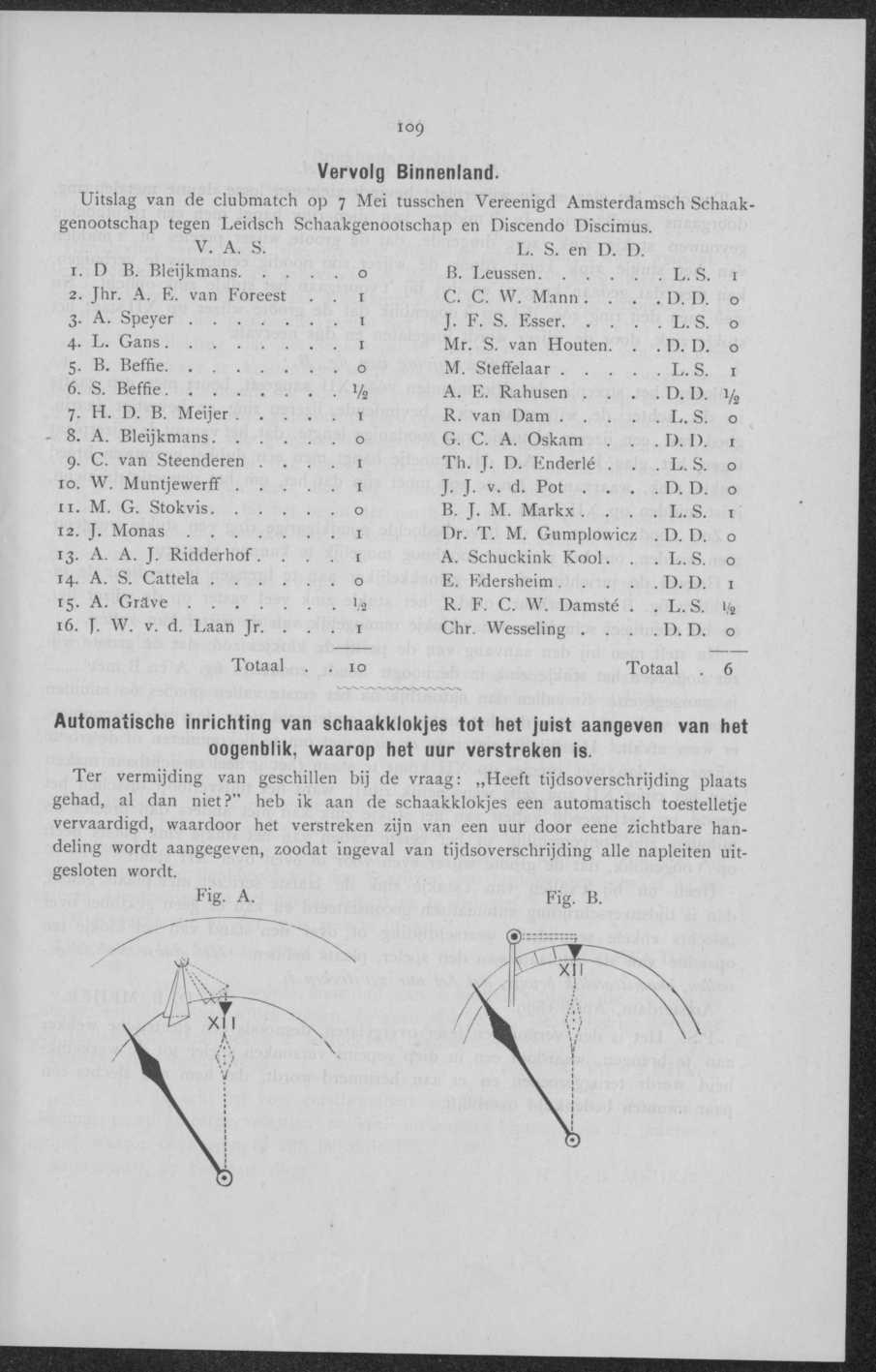 Uitslag van de clubmatch op 7 Mei tusschen Vereenigd Amsterdamsch Schaakgenootschap tegen Leidsch Schaakgenootschap en Discendo Discimus.