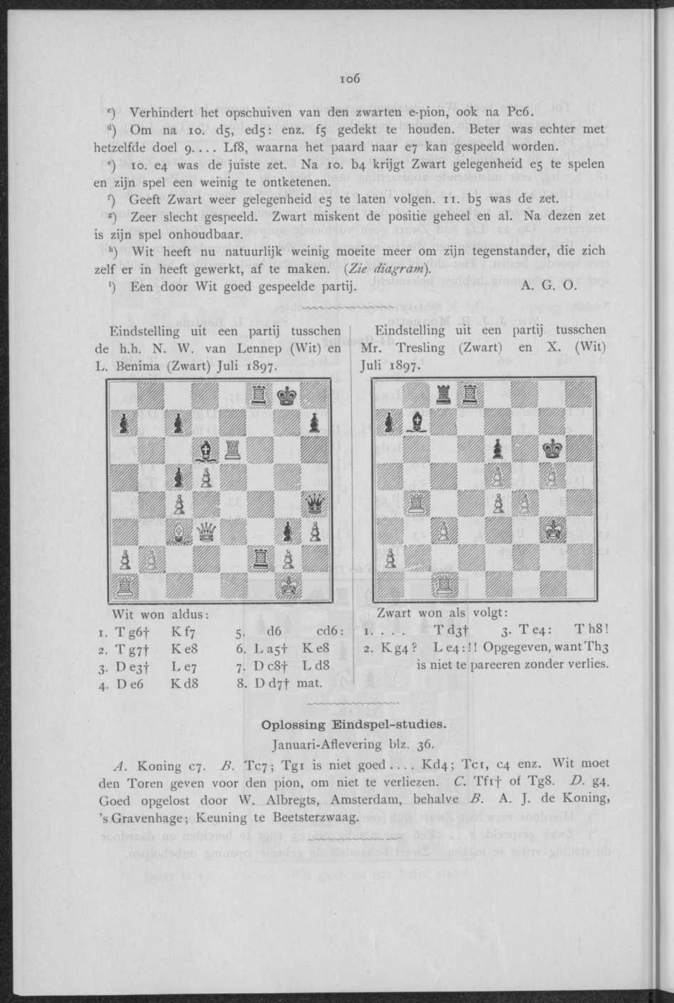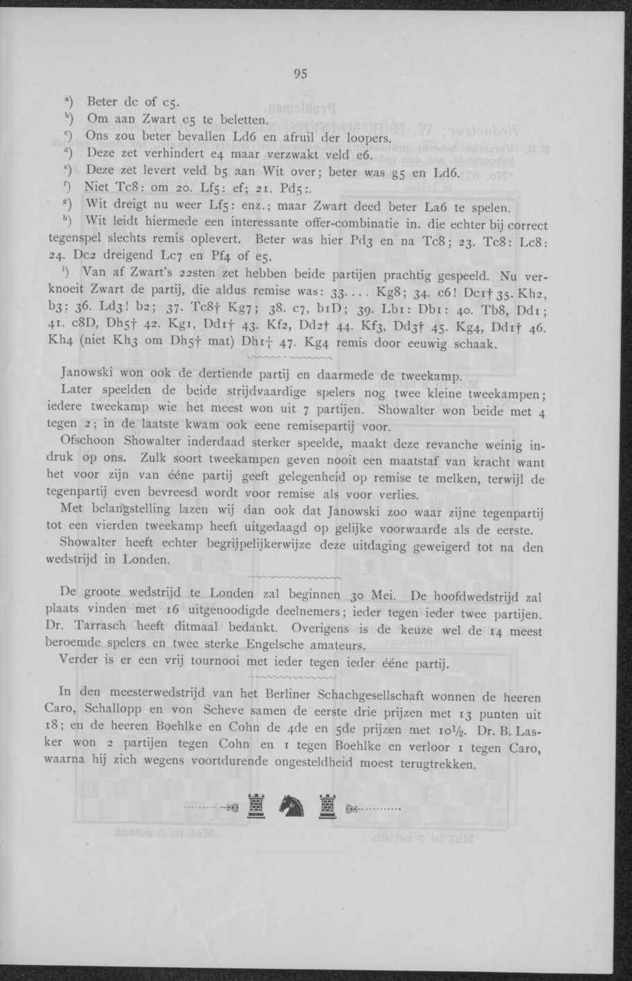 ware of thans weer wierd, de Bond ver over de Duizend leden zou tellen, en wat een kracht zou dan van den Bond kunnen uitgaan ; inplaats van zich streng te moeten houden aan het Binnenlandsche, zou ook het internationaal gedeelte onder handen kunnen genomen worden, en wedstrijden uitgeschreven worden, ook toegankelijk voor den buitenlander, terwijl schakers als de H.H. Tresling, Olland, de beide Foreesten, Loman, te Kolsté, Bleijkmans, Heemskerk, ons waarborgen op dergelijke Internationale wedstrijden lang geen slecht figuur te zullen maken en wij ook, even goed als Duitschland, Rusland, Oostenrijk, Engeland, Amerika, weldra onze Nederlandsche Meesters zouden kunnen aanwijzen.