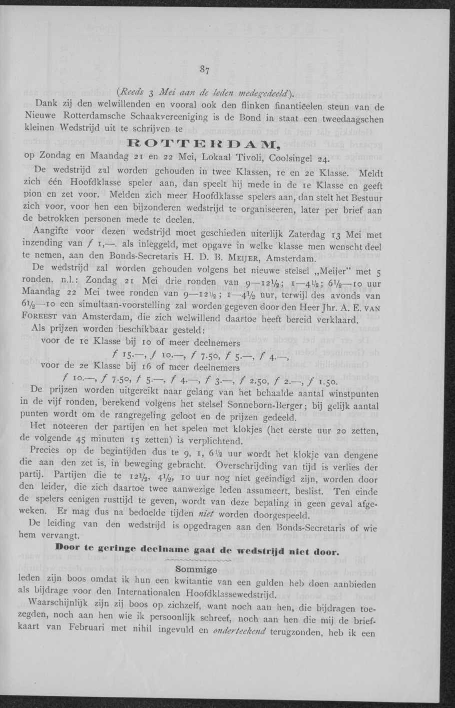 Dank zij den welwillenden en vooral ook den flinken finantieelen steun van de Nieuwe Rotterdamsche Schaakvereniging is de Bond in staat een tweedaagschen kleinen Wedstrijd uit te schrijven te