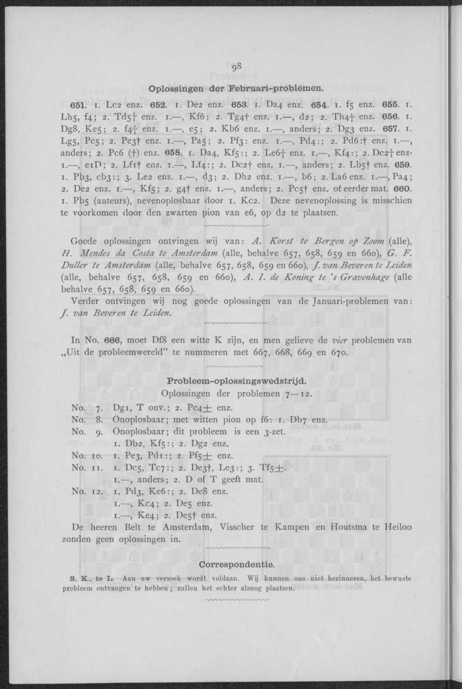 INHOUD: Oude liefde roest niet; Bondszaken; Verslag Kleine Wedstrijd Leeuwarden, Arnhem en Leiden; Binnenland; Telegrafische partij Soerabaia—Batavia; Partijen tweekamp Janowski—Showalter; Problemen; Verschillende partijen; Automatische inrichting van schaakklokjes; Boekbeoordeeling; Eindstellingen.
