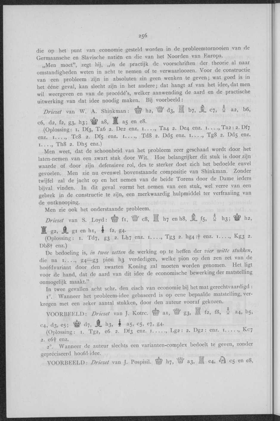 Men weet, dat de schoonheid van het probleem zeer geschaad wordt door het laten-nemen van een zwart stuk door Wit. Hoe belangrijker dit stuk is door zijn waarde of door zijn defensieve rol, des te sterker doet zich het bedoelde euvel gevoelen. Men zie nu evenwel bovenstaande compositie van Shinkman. Zonder twijfel zal de jacht op en het nemen van de beide Torens door de Dame ieders bijval vinden. In dit geval vormt het nemen van een stuk, wel verre van een gebrek in de constructie te zijn, een merkwaardig hulpmiddel ter verfraaiing van de ontknooping.
