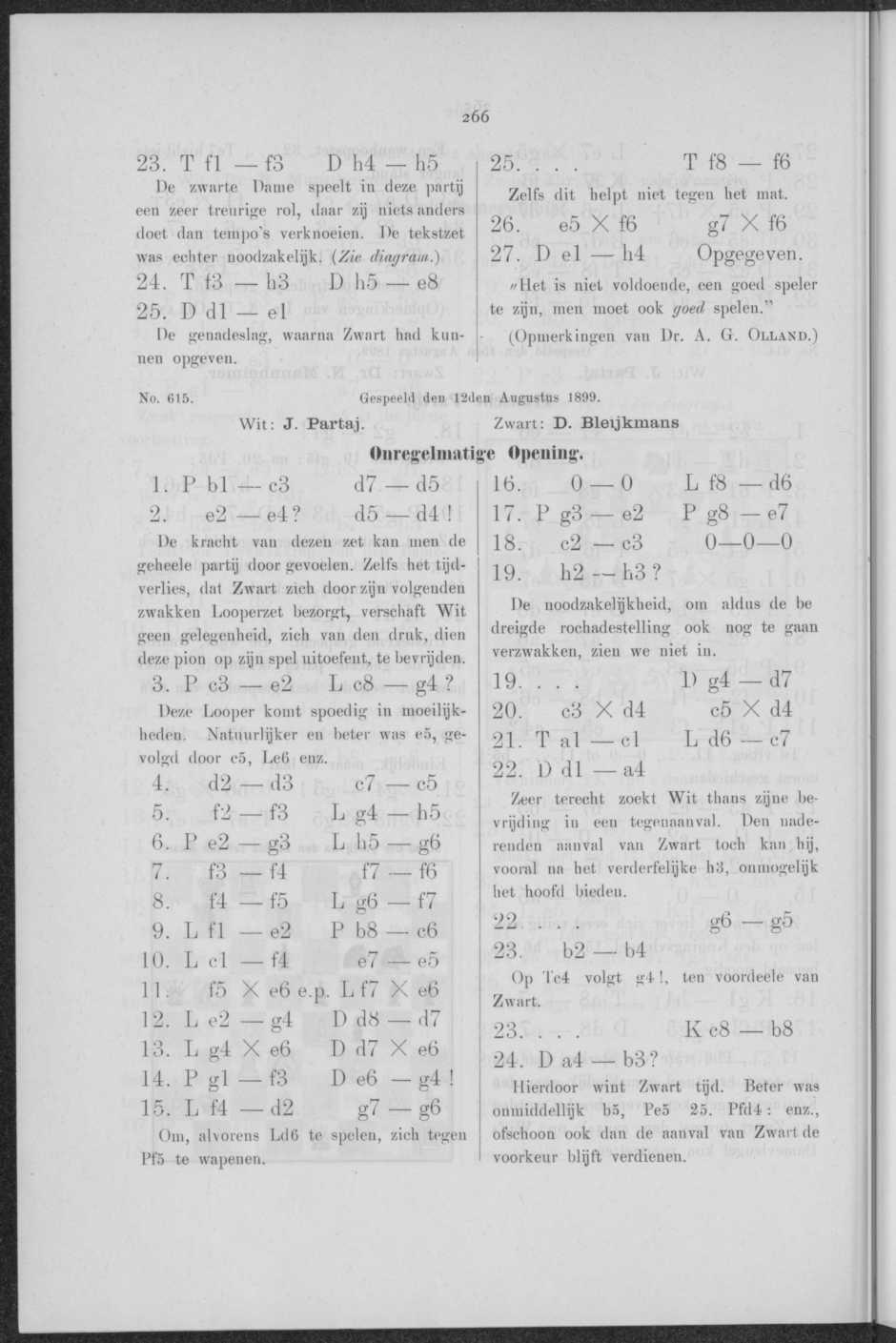 A. Y., te L. — De beide ons door u toegezonden partijen zijn door u goed, door uwe partners echter zeer slecht gespeeld. Dit laatste maakt publicatie der partijen in haar geheel onmogelijk. De eindstellingen kunnen ook niet worden geplaatst, daar het offer in de Fransche partij overbekend mag heeten, en het slot der Spaansche partij ontsierd wordt door het verzuimde, in noot h door u zei aangegeven mat in twee zetten.
