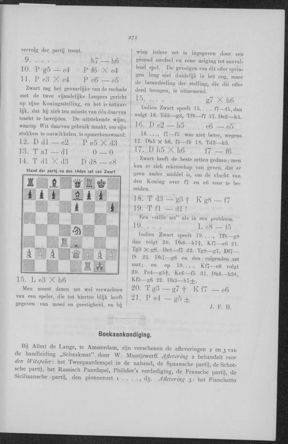 Zwart heeft de beste zetten gedaan; men kan er zich rekenschap van geven, dat er geen ander middel is, om de vlucht van den Koning over f7 en e6 voor te bereiden.