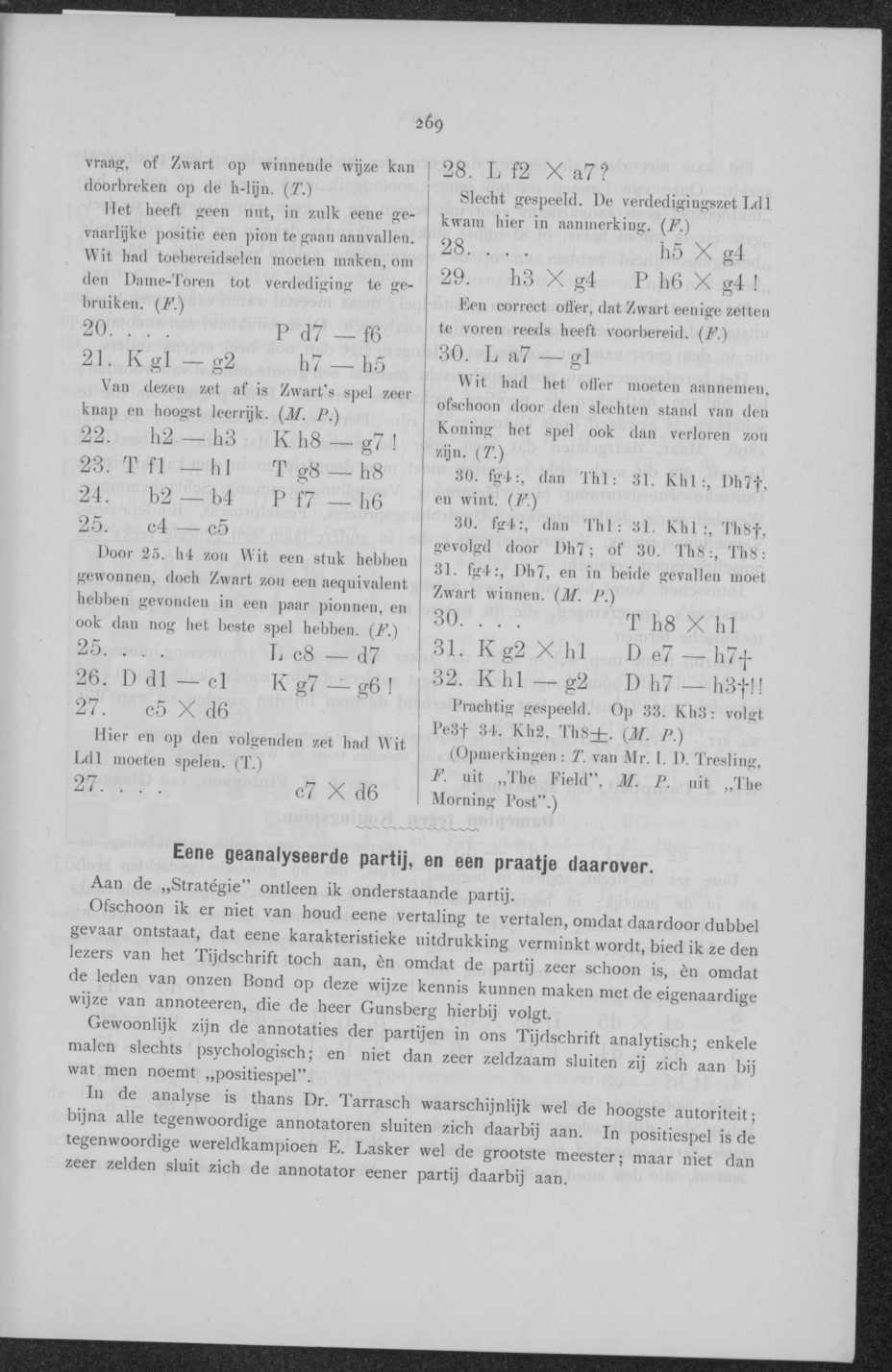 Intusschen komt het mij nu wel aardig voor, onderstaande partij te geven met Gunsberg's opmerkingen, die in sobere taal tegemoet komen aan het gemis van technische termen.