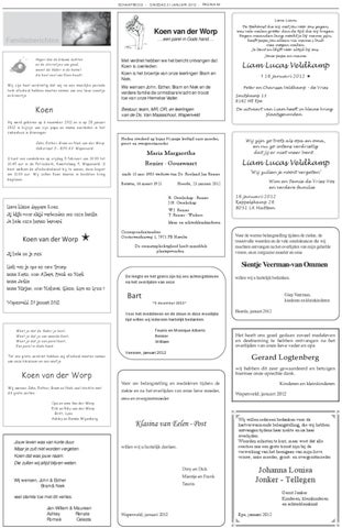 John, Esther, Bram en Niek van der Worp Valkstraat 3 - 8191 AV Wapenveld U kunt ons condoleren op vrijdag 3 februari van 10.00 tot 10.45 uur in de Petruskerk, Kwartelweg 9, Wapenveld. U bent welkom de afscheidsdienst bij te wonen, deze begint om 11.00 uur. Wij zullen Koen daarna in besloten kring begraven.