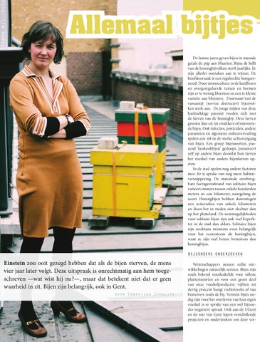 Allemaal bijtjes De laatste jaren geven bijen in massale getale de pijp aan Maarten. Bijna de helft van de honingbijvolken sterft jaarlijks. Er zijn allerlei oorzaken aan te wijzen. De hoofdoorzaak is een regelrechte hongersnood. Door monocultuur in de landbouw en overgereguleerde tuinen en bermen zijn er te weinig bloemen en een te kleine variatie aan bloemen. Daarnaast tast de varoamijt (varroa destructor) bijenvolken sterk aan. De jonge mijten van deze hardnekkige parasiet voeden zich met de larven van de honingbij. Deze larven groeien dan uit tot zwakkere of misvormde bijen. Ook infecties, pesticiden, andere parasieten en algemene milieuvervuiling spelen een rol in de sterke achteruitgang van bijen. Een groep bijensoorten, passend ‘koekoekbijen’ gedoopt, parasiteert zelf op andere bijen doordat hun larven het voedsel van andere bijenlarven opeten. In de stad spelen nog andere factoren mee. Er is sprake van nog meer habitatversnippering. De maximale overbrugbare foerageerafstand van solitaire bijen varieert immers tussen enkele honderden meters en een kilometer, naargelang de soort. Honingbijen hebben daarentegen een actieradius van enkele kilometers en doen het in steden niet slechter dan op het platteland. De nestmogelijkheden voor solitaire bijen zijn ook veel beperkter in de stad dan elders. Solitaire bijen zijn nochtans minstens even belangrijk voor het ecosysteem als honingbijen, want ze zijn veel betere bestuivers dan honingbijen. Bijzondere onderzoeken