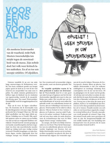 nen uit de nood te helpen. Hersenen, de kieskeurigaards, draaien alleen op glucose. Een tabletje druivensuiker is dus een welkome reddingsboei na urenlange afmatting door contemplaties over de zin van het leven. Of na pijnigingen over de naam van het goedje. Al valt daar niet veel achter te zoeken: de simpele duif die de naam druivensuiker opperde, wist dat er bijzonder veel glucose zit in druiven. Genoeg om er dan maar die naam op te plakken, dacht-ie. In werkelijkheid zijn druiven een veel te dure grondstof om druivensuiker uit te winnen. Donalds moeder zou zich zeker en vast tussen haar organische courgettes verstopt hebben als ze ’t hoorde, maar glucose wordt gemaakt uit zetmeel. Erger nog, dat zetmeel wordt onder meer gewonnen uit mais en rijst die hoogstwaarschijnlijk niet van eerlijke handel zijn. Een kastijding met hennepvezels voor de persoon die de naam druivensuiker bedacht heeft! ■