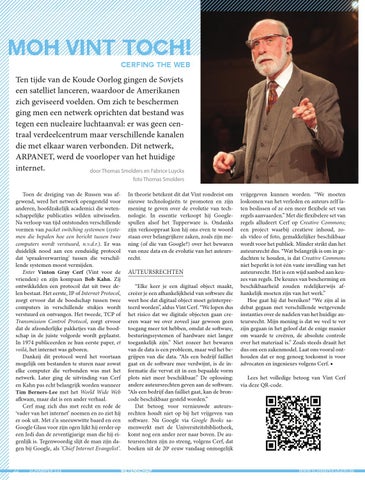 vrijgegeven kunnen worden. “We moeten loskomen van het verleden en auteurs zelf laten beslissen of ze een meer flexibele set van regels aanvaarden.” Met die flexibelere set van regels alludeert Cerf op Creative Commons; een project waarbij creatieve inhoud, zoals video of foto, gemakkelijker beschikbaar wordt voor het publiek. Minder strikt dan het auteursrecht dus. “Wat belangrijk is om in gedachten te houden, is dat Creative Commons niet beperkt is tot één vaste invulling van het auteursrecht. Het is een wijd aanbod aan keuzes van regels. De keuzes van bescherming en beschikbaarheid zouden redelijkerwijs afhankelijk moeten zijn van het werk.” Hoe gaat hij dat bereiken? “We zijn al in debat gegaan met verschillende wetgevende instanties over de nadelen van het huidige auteursrecht. Mijn mening is dat we veel te ver zijn gegaan in het geloof dat de enige manier om waarde te creëren, de absolute controle over het materiaal is.” Zoals steeds draait het dus om een zakenmodel. Laat ons vooral onthouden dat er nog genoeg toekomst is voor advocaten en ingenieurs volgens Cerf. ■ Lees het volledige betoog van Vint Cerf via deze QR-code.