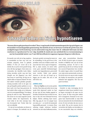 fascinatie spreekt verreweg het meest tot de verbeelding. In dat geval hoor je het proefdier strak aan te kijken zonder ook maar één keer met je ogen te knipperen. Het is, mijns inziens, de meest echte vorm: geen materiële beslommeringen waarbij met kippenklauwen geworsteld moet worden. Enkel twee geesten waarvan er één zijn wil hoopt op te leggen aan de ander. Het ziet er ook echt badass uit. JUMMIE, KAAS Mijn kip Sophia zou de eerste patiënt worden. Naar mijn aanvoelen was ze nog steeds licht depressief omdat we haar dit jaar niet de kans hadden gegund te broeden. Ik had met haar te doen en wou haar er dan ook weer helemaal bovenop helpen. Slechts oefening baart kunst. Elke dag ging ik voor de spiegel staan om mijn gaze - zo wordt de innemende hypnoseblik genoemd - te trainen. Deze oefening voegde weliswaar kostbare minuten toe aan mijn badkamerroutine,