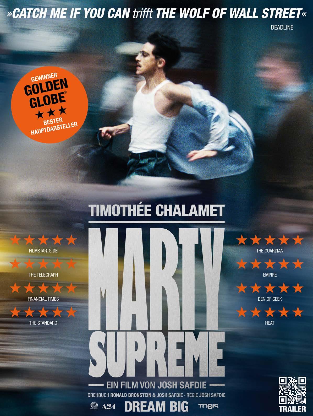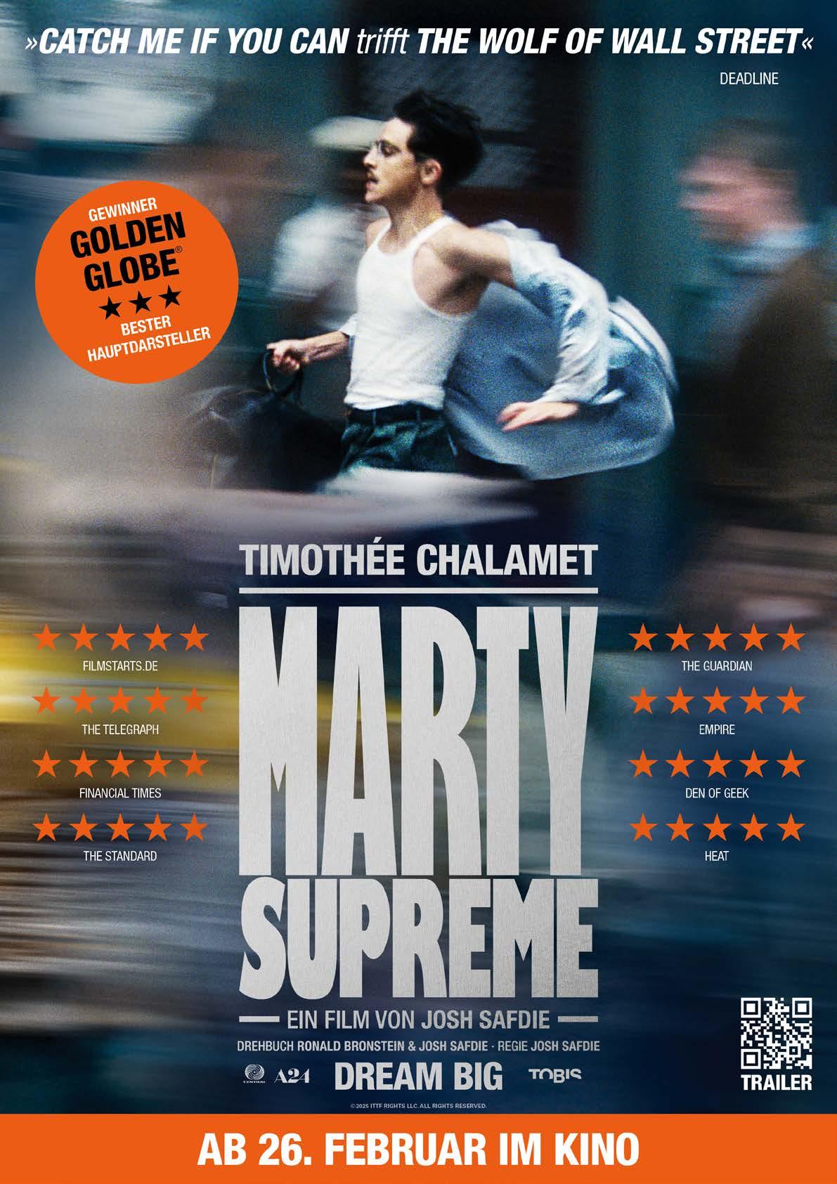 Den Auftakt macht Marty Supreme von Josh Safdie, ein energiegeladenes Porträt eines charismatischen Außenseiters, der mit Ehrgeiz, Risiko und Tempo seinen Platz in der Welt erkämpft.
