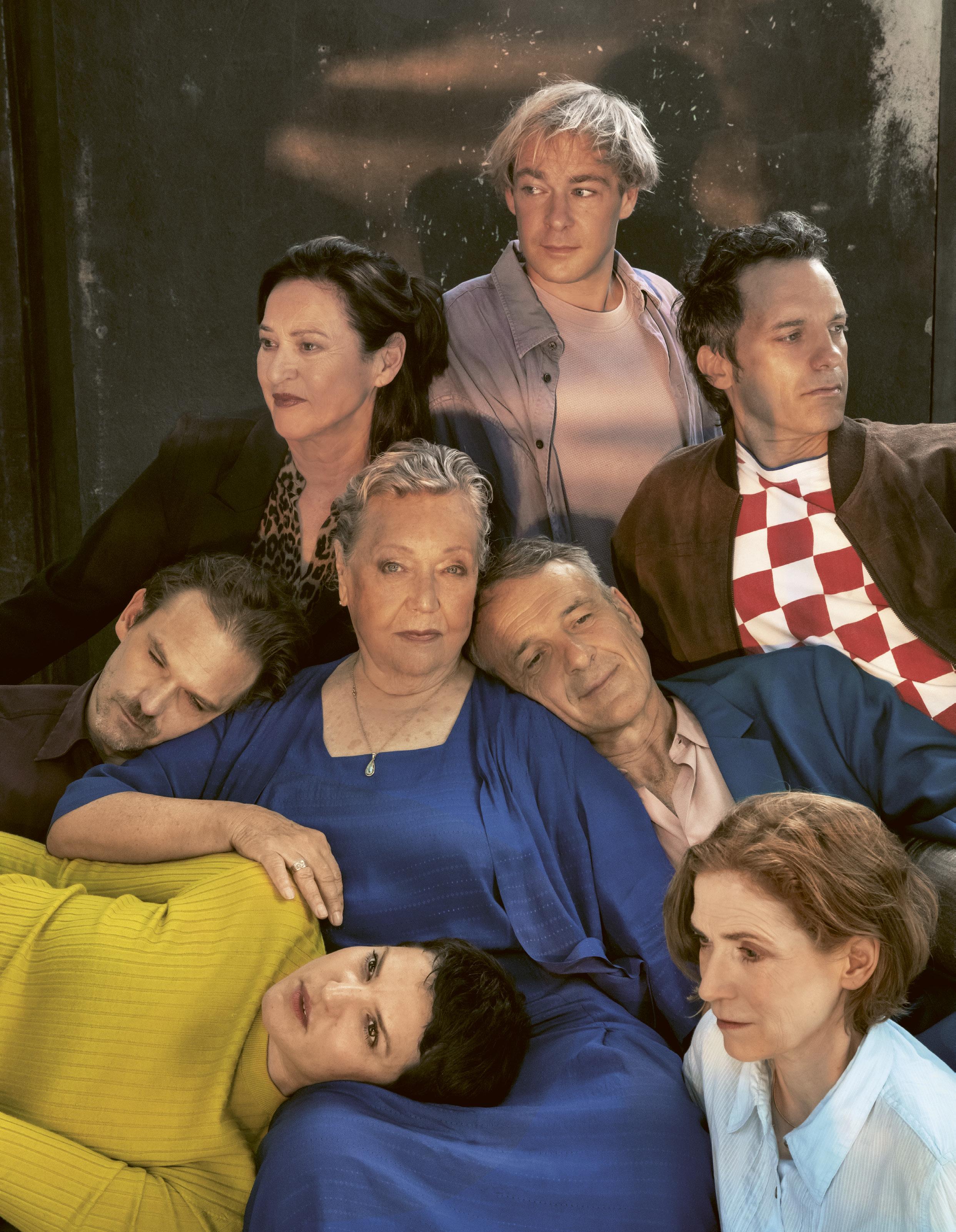 Die Regisseurin Jette Steckel inszeniert FRAU YAMAMOTO IST NOCH DA mit grossem Ensemble. Auf der Bühne im Pfauen spielen (v. l. n. r.): Daniel Lommatzsch, Charlotte Schwab, Nikola Weisse (als Frau Yamamoto), Alicia Aumüller, Matthias Neukirch, Mirco Kreibich, Thomas Wodianka und Judith Hofmann. Nicht im Bild sind Sebastian Rudolph sowie die vier Darsteller*innen der Kinder und Jugendlichen. Die Band THE NOTWIST schreibt die Musik für die Inszenierung.
