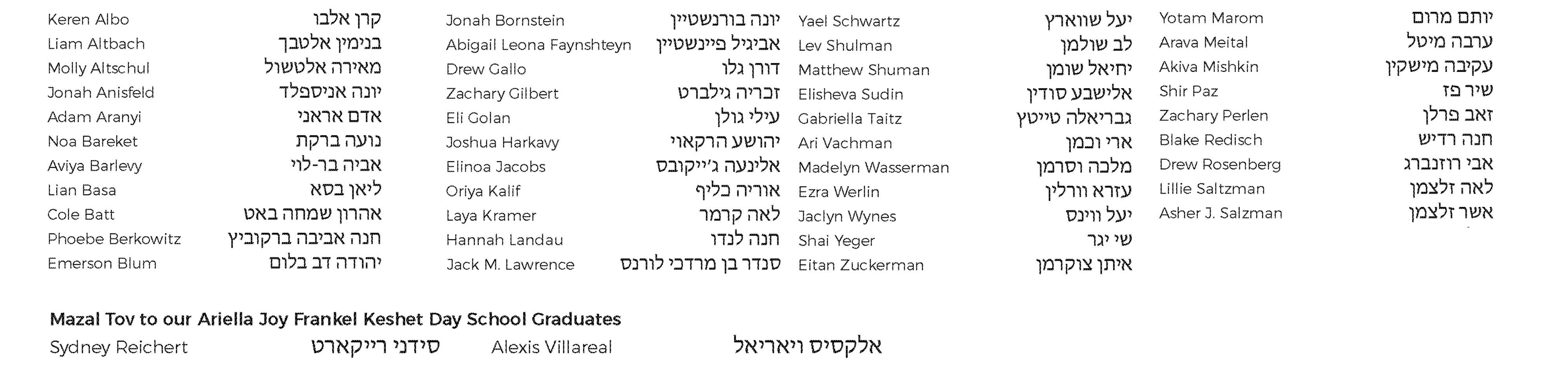 At the end of the 2024–2025 school year, we also said goodbye to the following members of our tzevet: Talia Anisfeld, Jaclyn Feather, Maris Fineberg, Eliana Horwitz, Yael Meshulam, and Samantha Sylverne. We are grateful for their devotion and service to our school.
