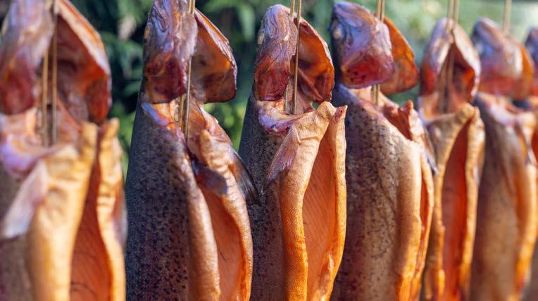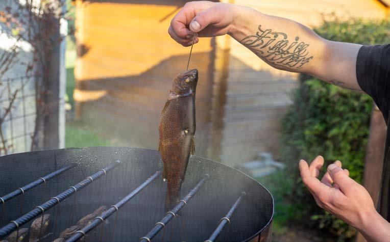 Ein neues Geschäftsfeld hat sich bei der Fischzucht Löhr in den vergangenen Jahren entwickelt: „Viele holen sich bei uns Setzlinge für den eigenen Teich. Später angeln sie im Garten – meistens mit den Enkeln –für den Eigenbedarf“, so Tim Kersting. Geblieben ist aber in seiner Fischzucht das Räuchern des Fisches nach altem Rezept: „Ich benutze dazu Buchenspäne und eine Räuchertonne. Das ist echtes Handwerk, und das schmeckt man auch“, versichert der Züchter. Angeboten werden neben den geräucherten Forellen (küchenfertig ausgenommen) auch LachsforellenFilet, in den Variationen Natur, mit Senf, Pfeffer, Orangenpfeffer, Knoblauch oder Dill gewürzt, dazu gebeizte und kaltgeräucherte Lachsforellen in dünnen Scheiben. Er selbst empfiehlt den Leserinnen und Lesern der HEIMATLIEBE frisches LachsforellenFilet auf einem Bett aus Gemüse: „Das geht ganz schnell und schmeckt gerade jetzt sehr lecker.“
