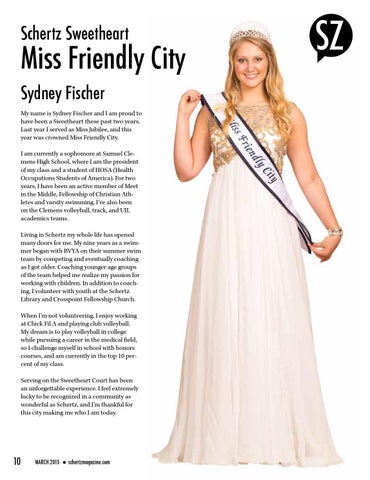 Miss Friendly City Sydney Fischer My name is Sydney Fischer and I am proud to have been a Sweetheart these past two years. Last year I served as Miss Jubilee, and this year was crowned Miss Friendly City. I am currently a sophomore at Samuel Clemens High School, where I am the president of my class and a student of HOSA (Health Occupations Students of America). For two years, I have been an active member of Meet in the Middle, Fellowship of Christian Athletes and varsity swimming. I’ve also been on the Clemens volleyball, track, and UIL academics teams. Living in Schertz my whole life has opened many doors for me. My nine years as a swimmer began with BVYA on their summer swim team by competing and eventually coaching as I got older. Coaching younger age groups of the team helped me realize my passion for working with children. In addition to coaching, I volunteer with youth at the Schertz Library and Crosspoint Fellowship Church. When I’m not volunteering, I enjoy working at Chick Fil A and playing club volleyball. My dream is to play volleyball in college while pursuing a career in the medical field, so I challenge myself in school with honors courses, and am currently in the top 10 percent of my class. Serving on the Sweetheart Court has been an unforgettable experience. I feel extremely lucky to be recognized in a community as wonderful as Schertz, and I’m thankful for this city making me who I am today.