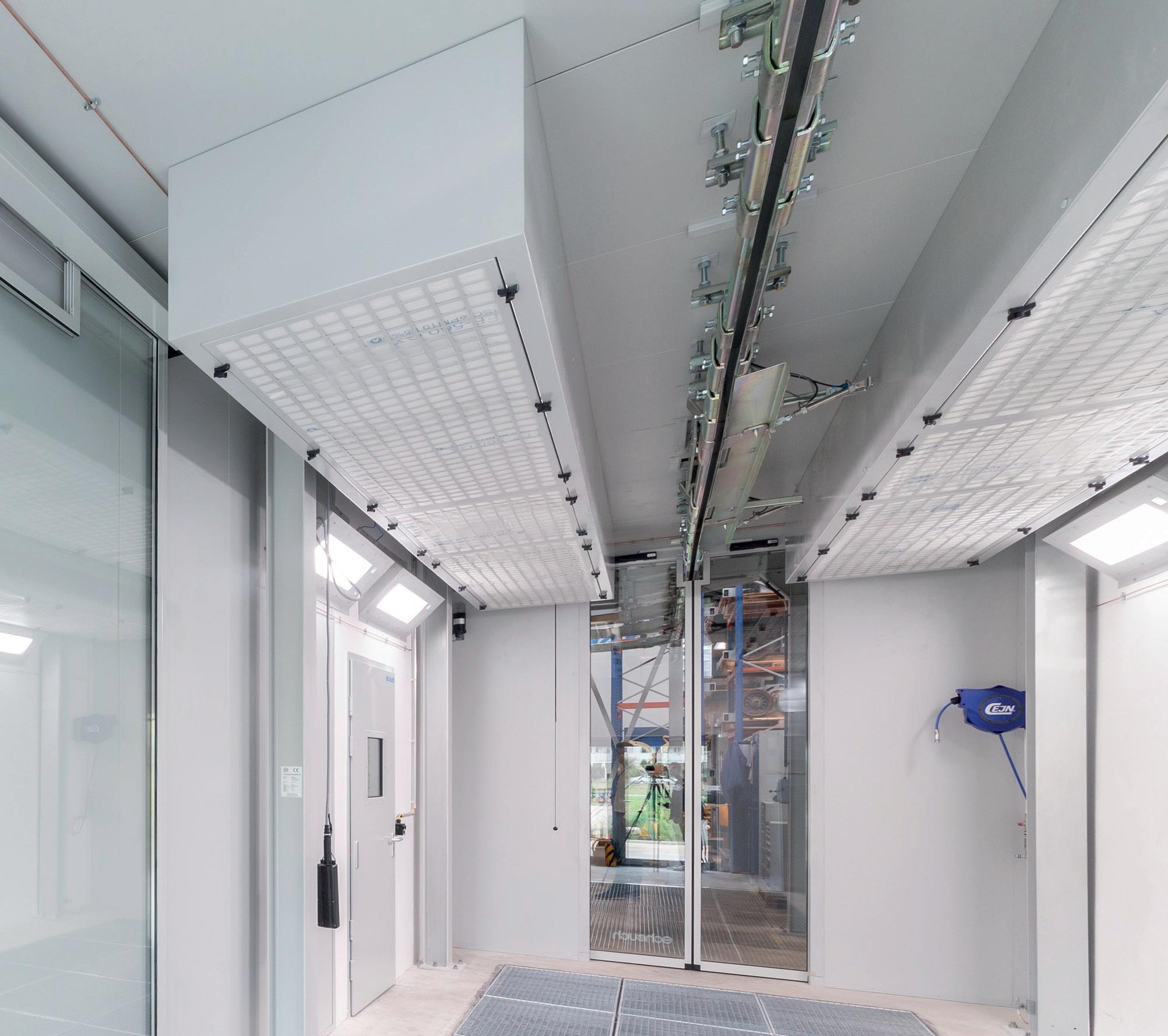 Die Wände und Decken wurden komplett mit Sandwich-Paneelen verkleidet. Durch die besonders glatte Ausführung dieser Paneele werden Staubablagerungen stark reduziert – ein wesentlicher Faktor für eine perfekte Oberfläche. Darüber hinaus verleiht diese Ausführung der Anlage ein optisch sauberes Erscheinungsbild. In den Lackierräumen können