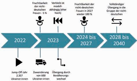 Die unterstellten Annahmen orientieren sich an denen der 15. kBV, die in verschiedenen Varianten Außenwanderungssalden unterstellt. Bis 2030 wird der Pfad W2 verfolgt, der vorsieht, dass der hohe Wanderungssaldo des Jahres 2022 auf ein Niveau von 300.000 pro Jahr schmilzt. Danach wird das Niveau dieser Gewinne bis 2045 konstant gehalten. Damit liegt der langfristige Trend des Außenwanderungssaldos zwischen den Pfaden W2 mit +250.000 und W3 mit +350.000 Personen pro Jahr.