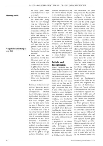 me Dinge getan haben, sonst hätte Hitler sie nicht so bestraft). • Gut, dass die Deutschen es den Amerikanern gezeigt haben mit der Verweigerung der Beteiligung am Krieg im Irak. Ihr Land hat damit Selbstbewusstsein bewiesen: dass gefällt uns. Wir Saudis trauen uns nicht, eine solche klare Haltung zu irgendetwas einzunehmen. • Ein Syrer: ‚wir haben jeden Tag dafür gebetet und gehofft, dass Hitler den Krieg gewinnt. Daran waren wir interessiert, um endlich die französische Herrschaft loszuwerden. • Wenn man mal nach Deutschland kommt, dann fällt einem sofort auf, wie sauber und geordnet alles ist (kein Chaos wie bei uns). Es gibt vielleicht mehr Vorschriften für die Menschen, aber dann weiß man doch, dass man sich darauf wirklich verlassen und sicher fühlen kann. Kein Vergleich zu Saudi Arabien! Wenn man die fast immer sehr positiven Meinungen vorsichtig zu relativieren versucht (innenpolitische Situation, Judenverfolgungen, Israel, Arbeitslosigkeit, deutsches OstWest-Problem etc.), dann wird man rasch korrigiert: ‚Jedes Land hat doch seine Probleme, aber ihr Deutschen packt sie wenigsten an und macht – aus unserer Sicht – fast alles richtig. Interessant: die EU wird immer wieder angesprochen als kommender Gegenpol zu den USA und als – positiv bewerteter – Machtfaktor in der Welt. Frankreich wird hier praktisch nirgendwo erwähnt, die Engländer gelten – wie wir – als zuverlässige Fachleute. Zu den USA gibt es eine gespaltene Einstellung: positiv