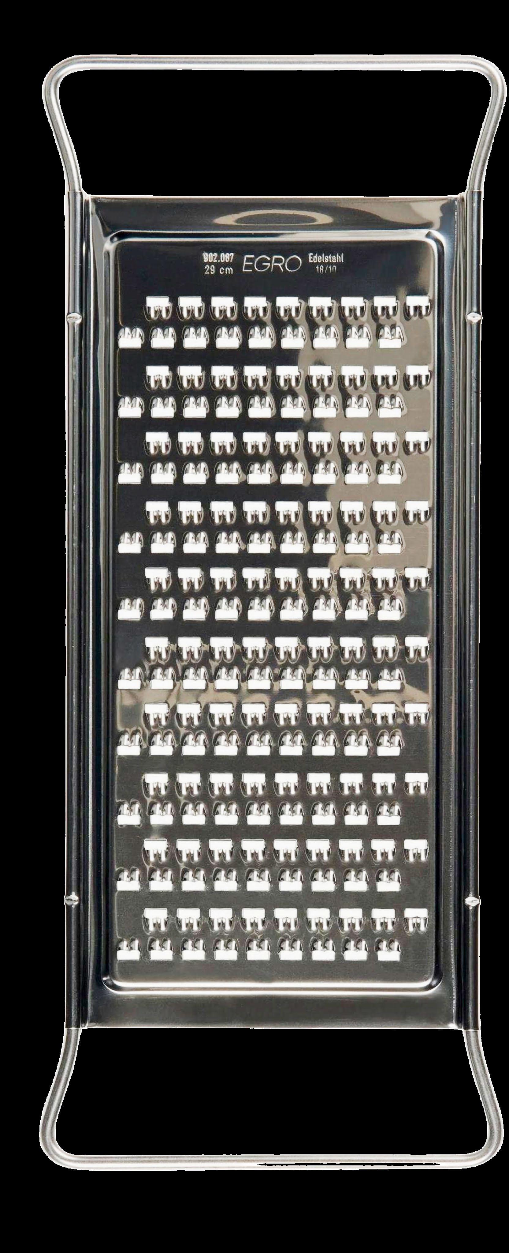 Die Bircherraffel wird oft im selben Atemzug wie die Knoblauchpresse und der Sparschäler genannt, obwohl sie gut dreissig Jahre früher erfunden wurde. Auch materialtechnisch unterscheiden sich die Schweizer Küchengeräte deutlich voneinander: Der Sparschäler war klassischerweise aus Aluminium gefertigt, das günstig in Produktion und Anschaffung war. Die Bircherraffel hingegen besteht aus rostfreiem Edelstahl, der langlebig, leicht zu reinigen sowie korrosionsbeständig und hygienisch ist. Bereits zwei Jahre nach dem ersten Patent fand 1914 im schwedischen Malmö eine Edelstahlausstellung für das breite Publikum statt. Mit seiner rasanten Verbreitung in europäischen Metallwarenfabriken trat Edelstahl in den 1920er-Jahren mit Produkten wie dem Handrührgerät, dem Teesieb und der Bircherraffel einen Siegeszug durch die europäischen Haushalte an. Das Material prägte übrigens noch eine weitere Schweizer Industrieikone: Victorinox. Die Messerfirma benannte sich im Jahr 1921 um, der neue Name ist eine Kombination des bisherigen Markennamens Victoria und der Bezeichnung für rostfreien Stahl, Inox.